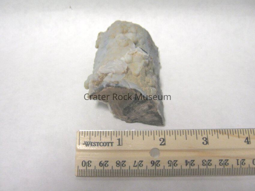 Description: A calcareous coated limb cast from the Green River Formation in Wyoming, the outer is a blue-grey calcareous agate, the inner branch shows brown, black, and beige with the presence of growth rings and rays.