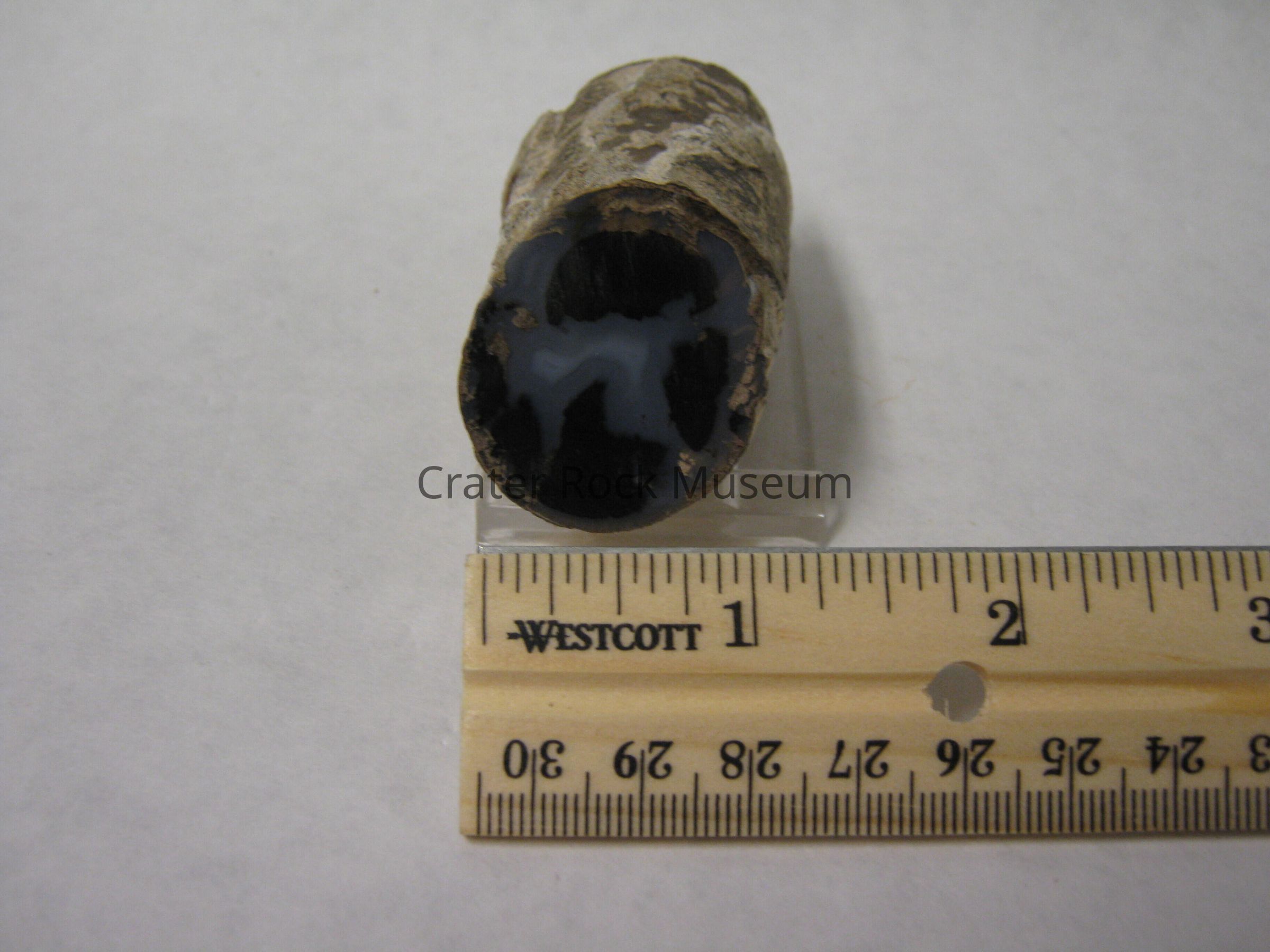 Description: This is one of four limbcast (B) from Delmars Collection: colored: outer is a chalky tanish-beige, inner cast shows a clear grey-blue and black agate along with some beige segments.