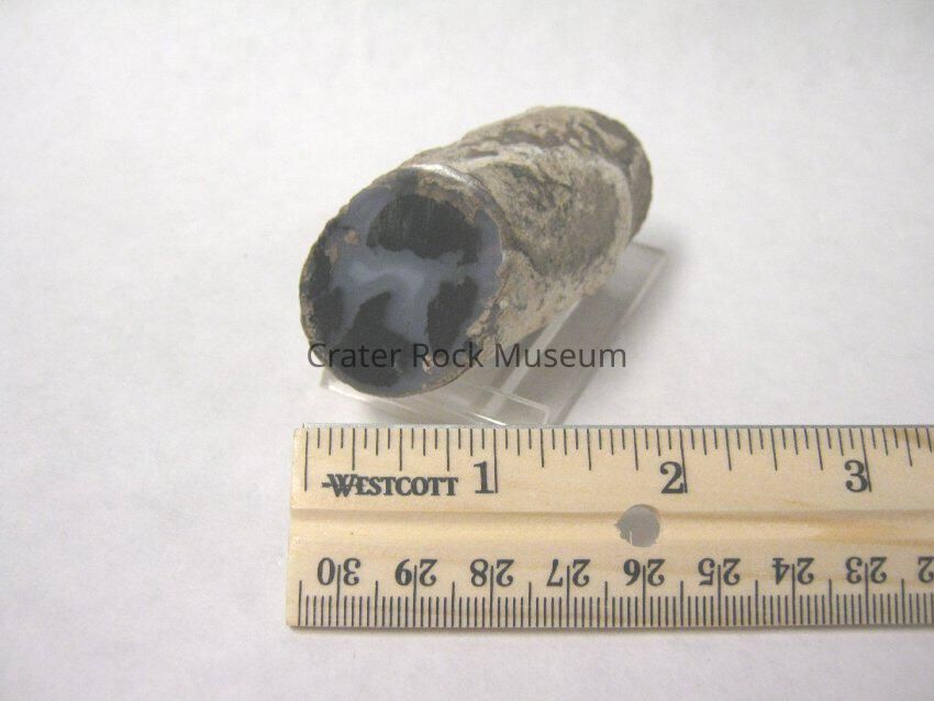 The original description by Delmar: Five pieces of limbcasts after bamboo, from Wyoming. Polished ends show black and beige wood in grey agate (fortified in most outer cast is in beige and brown). Delmar estimated these pieces to be 200 million years old (Jurassic Period)