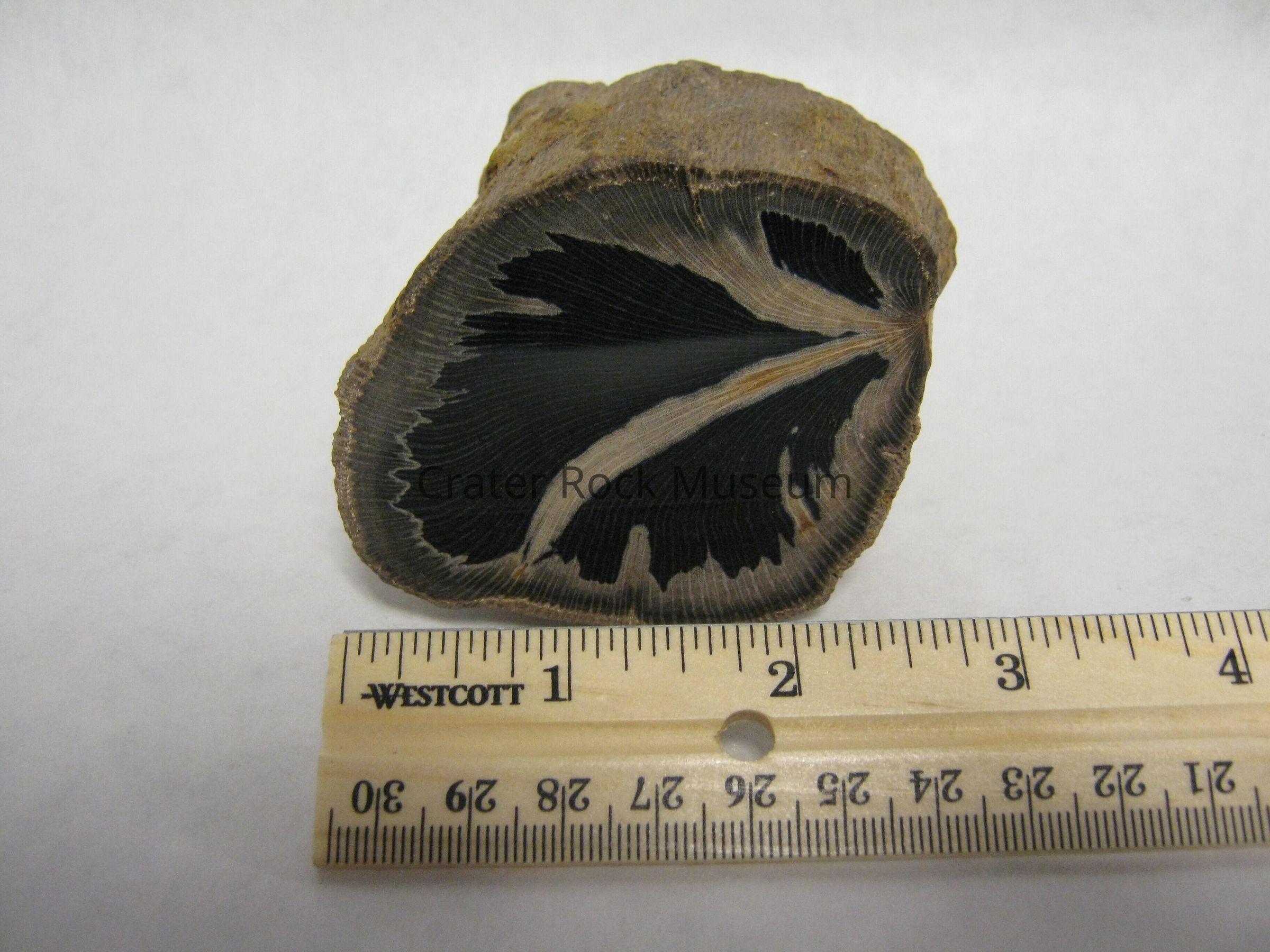 Description: Polished face shows grey, brown and black wood with rings, rays and pores present.