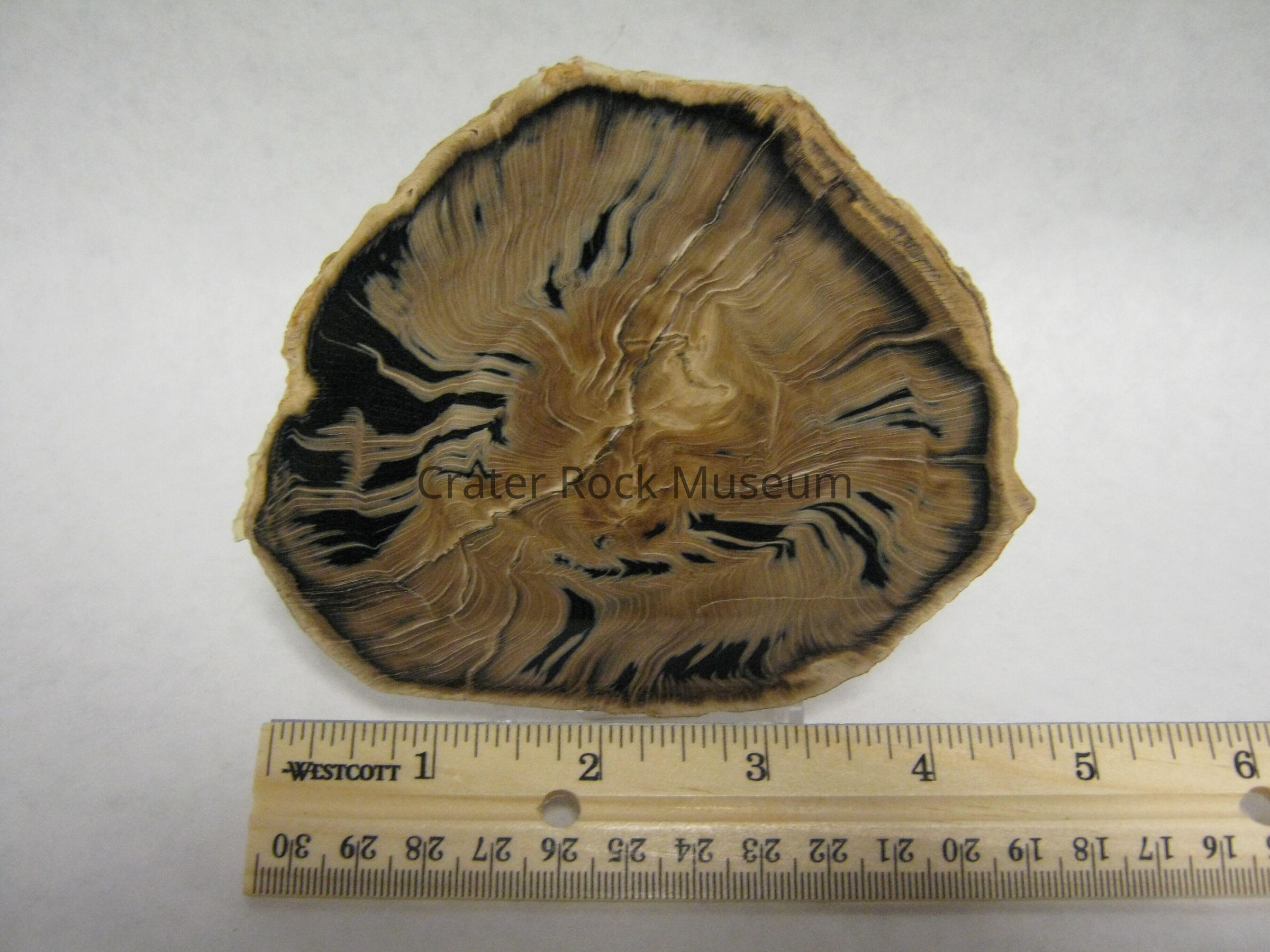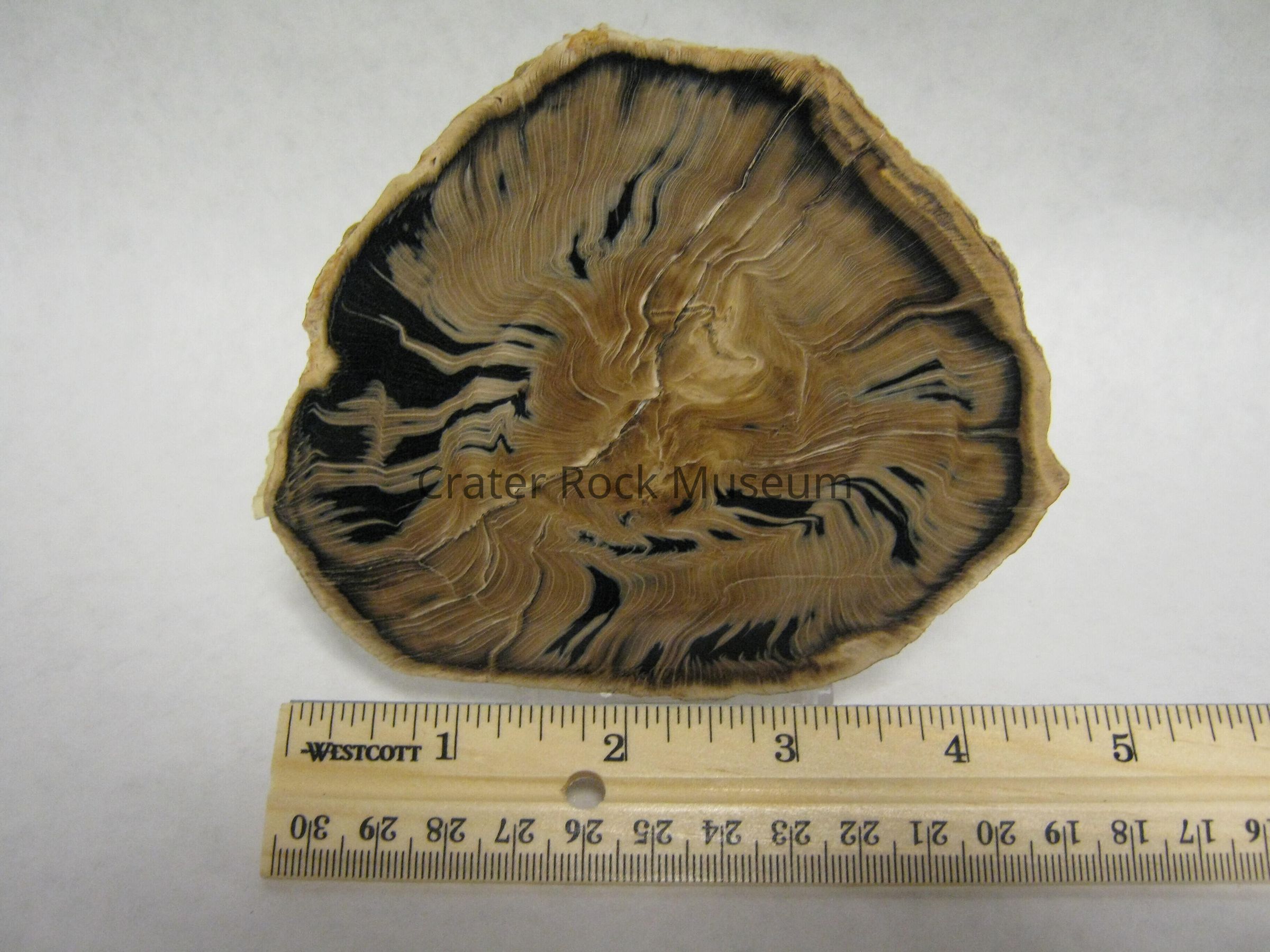 Description: Thin slab with polished face. Tan outer band with a black inner band surrounding a tan and light brown swirling pattern eminating from the center.