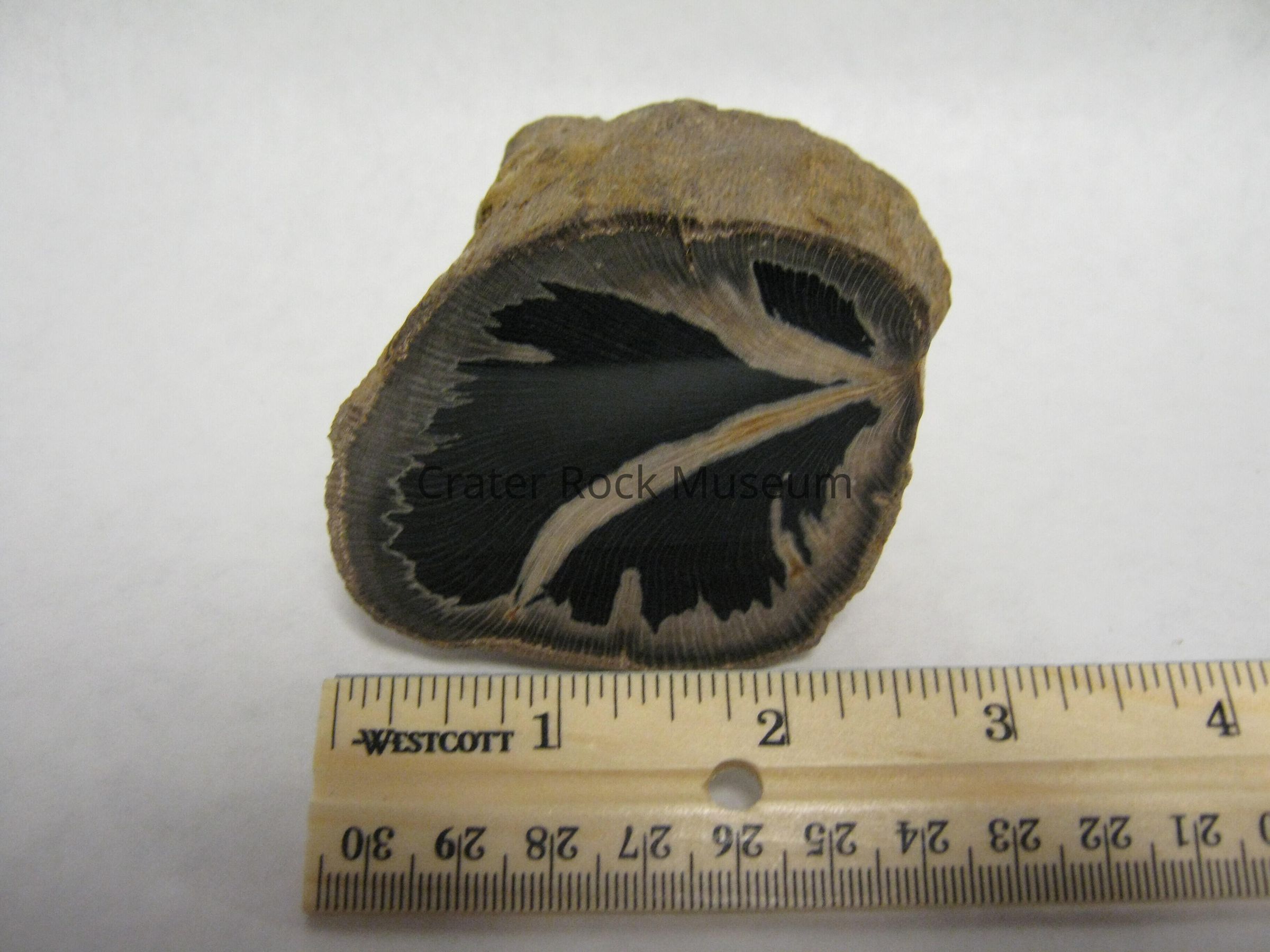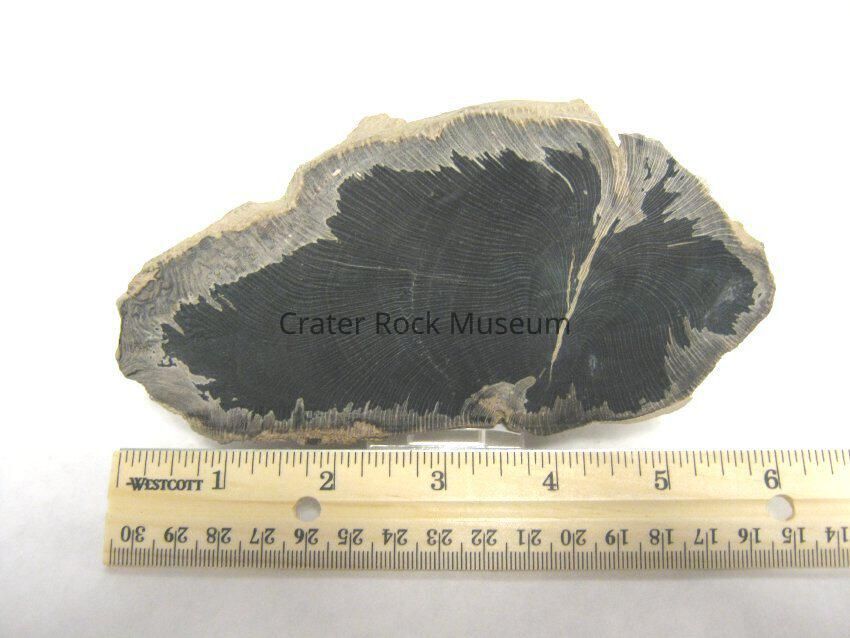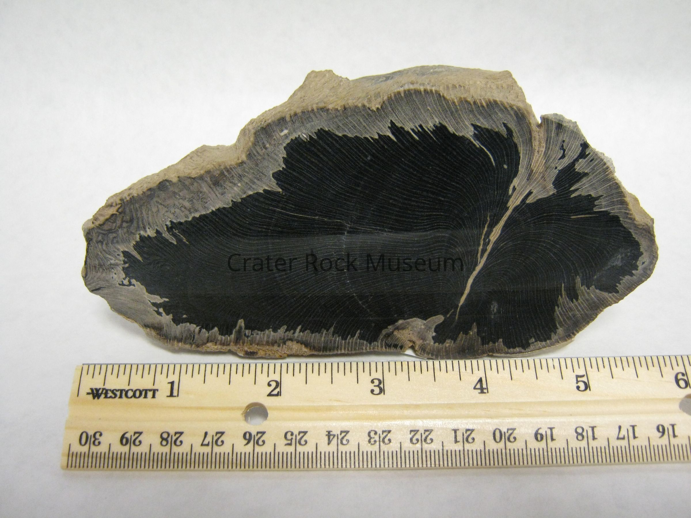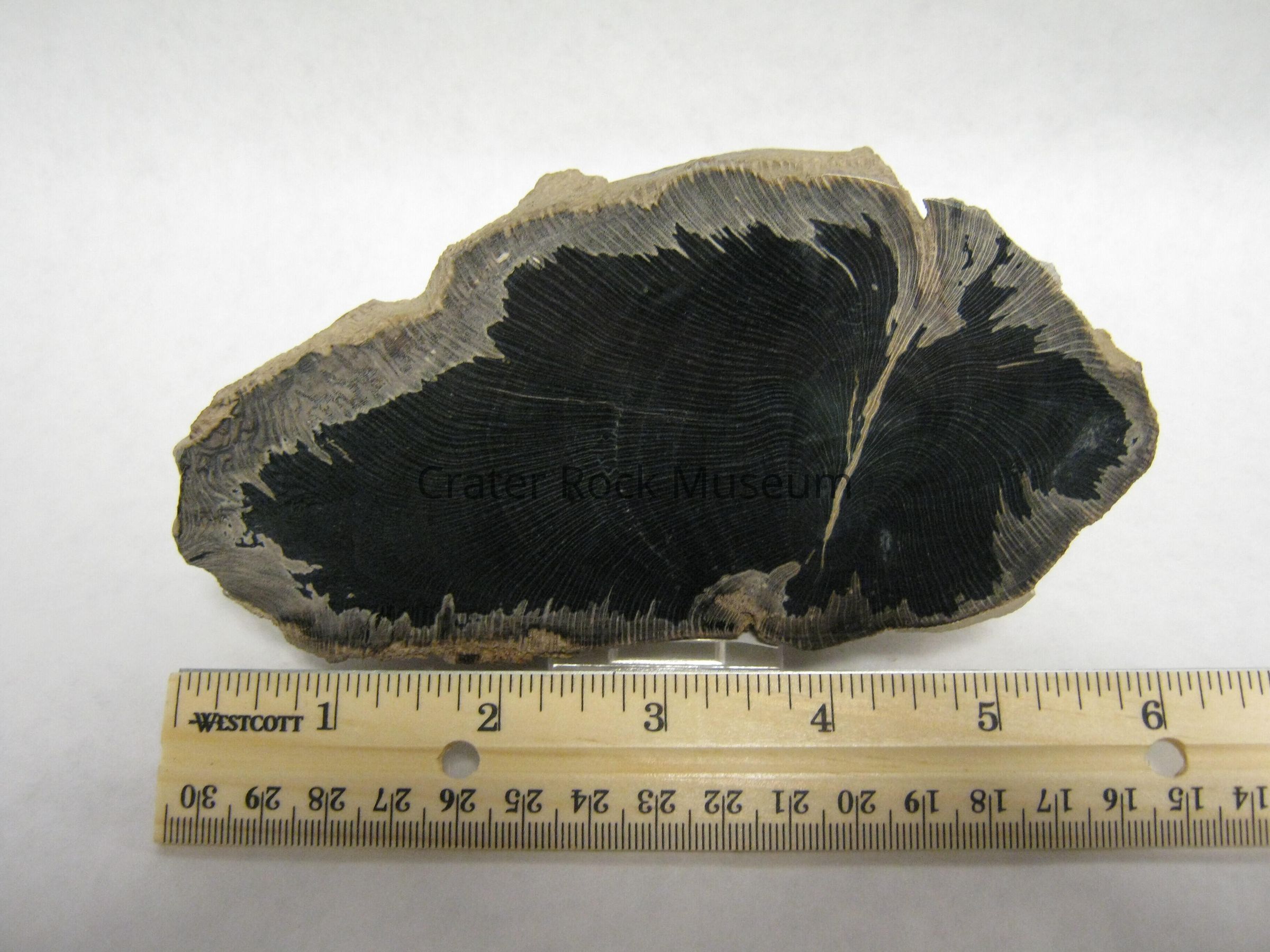 Description: Delmar describes this specimen as a limb of petrified wood from Sweethome, Oregon (west central oregon) a variety of "sycamore". Polished end shows greys, black, some brown and beige. Delmar believed the specimen is of the tropical variety and was probably from the Jurassic period, mesozoic era.