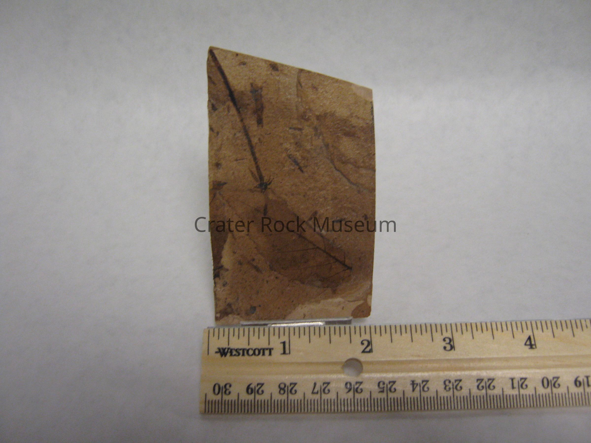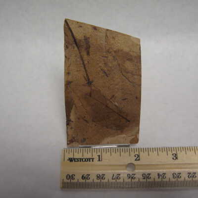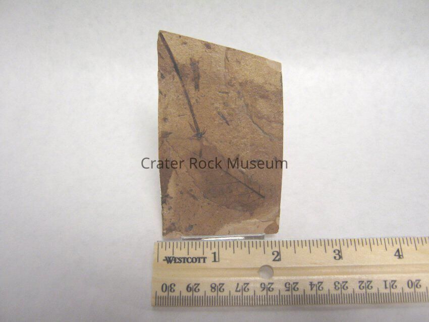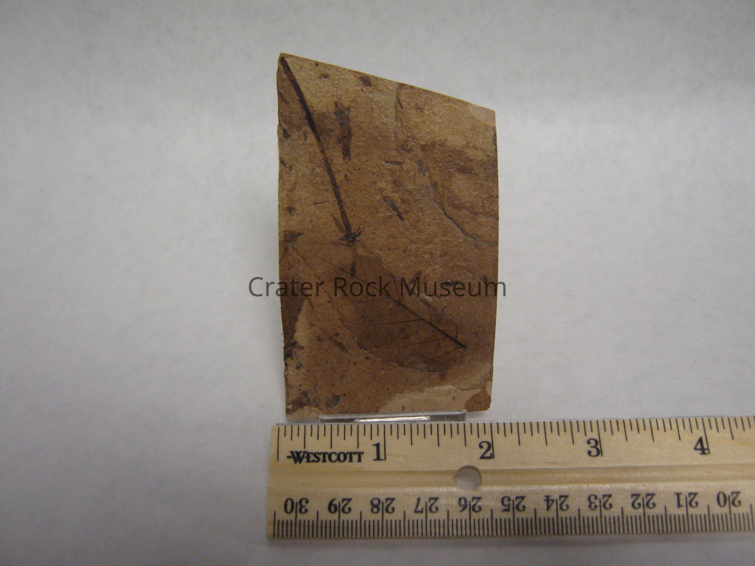 Leaf fossils in this case are carbon films that remain on the bedding surfaces of fine-grained sediments. Fossilization happened after the leaves sank to the bottom of a pond or lake and were later buried by additional fine-grained sediments. With burial, the leaves were compressed and the sediment surrounding them solidified. Eventually these fine-grained sediments became sandstone, shale or mudstone. When all the volatile organic material in the living leaf was pressed out, only a thin carbon residue was left in the sediment, marking the outline and veins of the leaf.