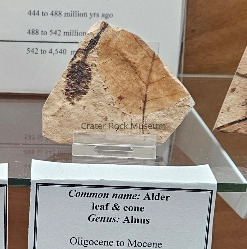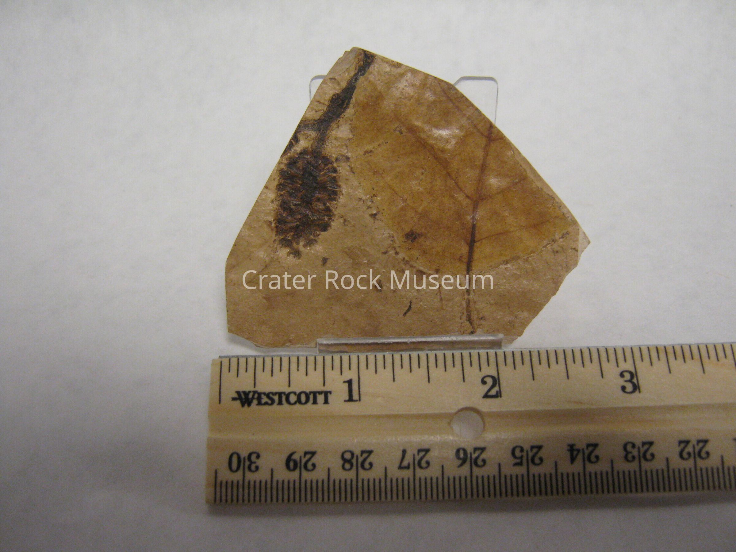 Alder leaf imprint on a beige sandstone. Also includes an alder cone.