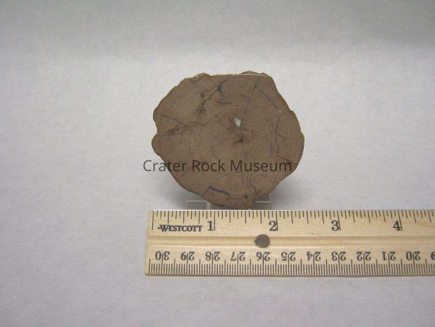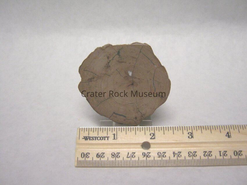 Description: Small round piece of petrified wood from Sams Valley. The specimen is filled with opal and agate on the uncut side. The polished face shows a tan color with cracks clear agate and one spot of white agate. Growth rings, rays and grain are apparent.