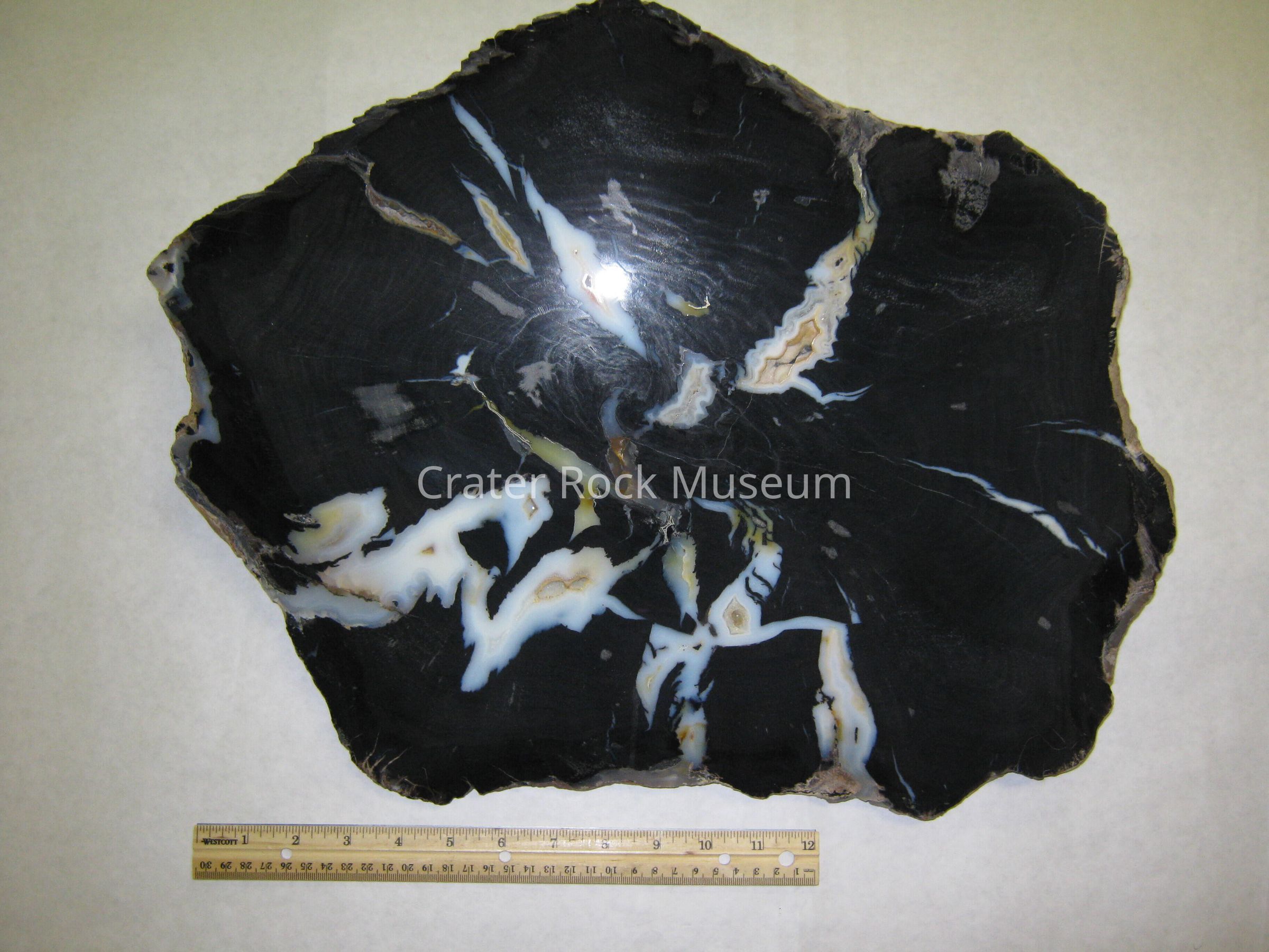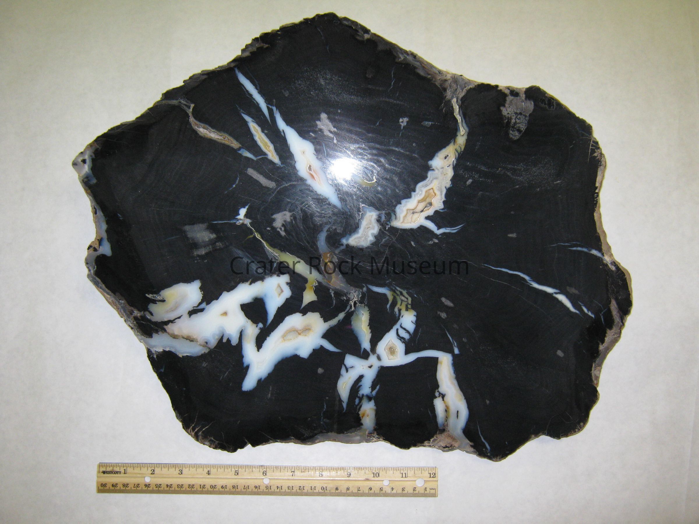 Description: Complete large round slab polished face shows a very black with white agate running through it.