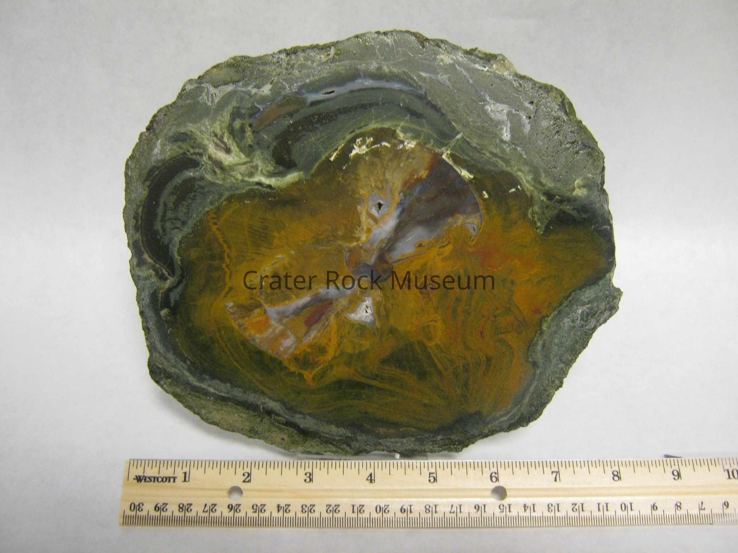Description: A complete round the slabs polished face is green, red, brown, and golden with white & crystaline agate.