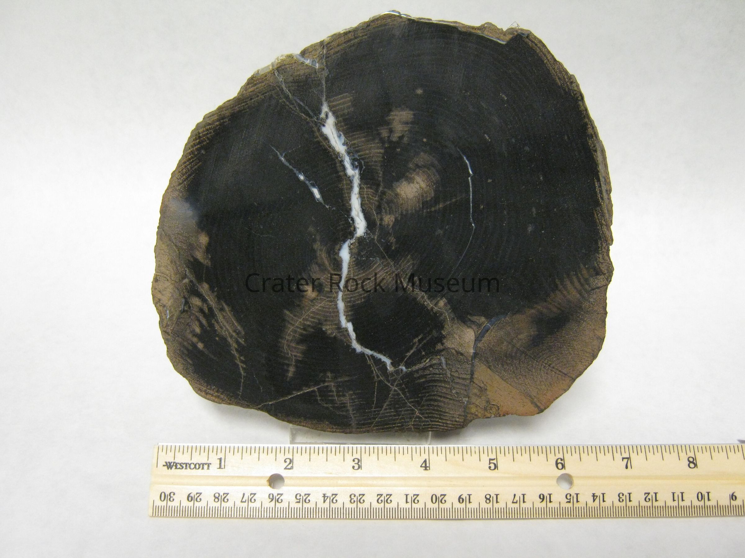 Description: Thick slab with polished face. Mostly black on face with some areas of brown. Some growth rings are visible.