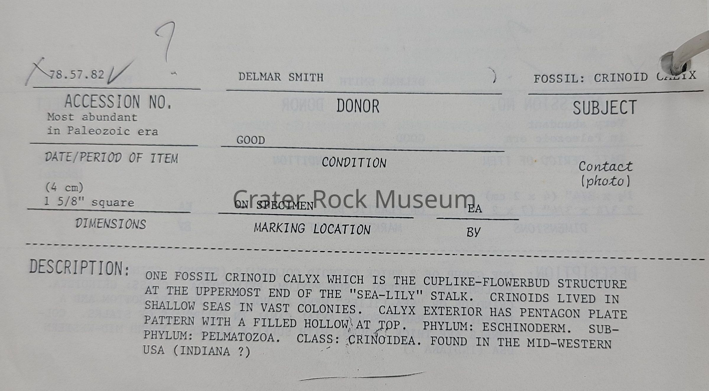 Calyx exterior has a pentagonal pattern with a filled (permineralized) hollow on its dorsal (top) side.Collection