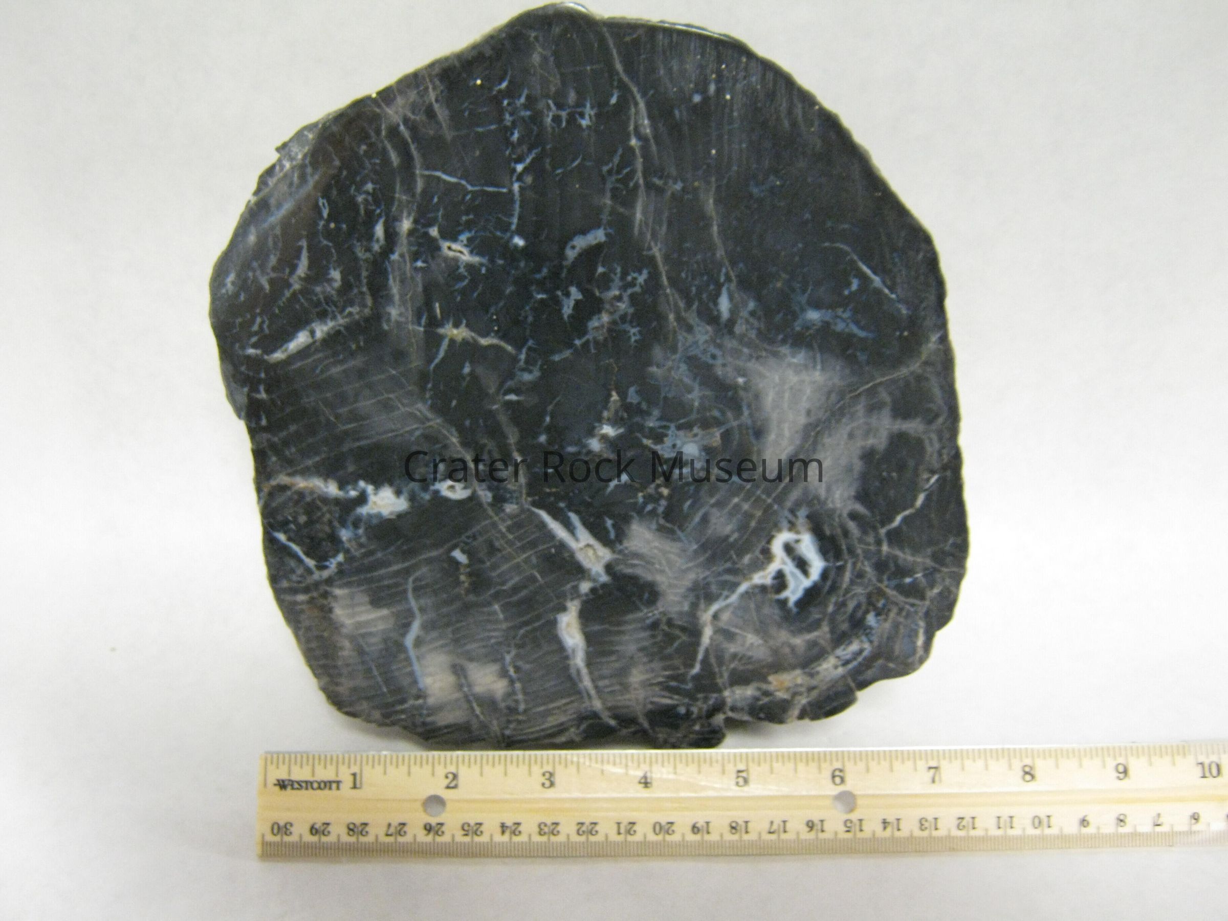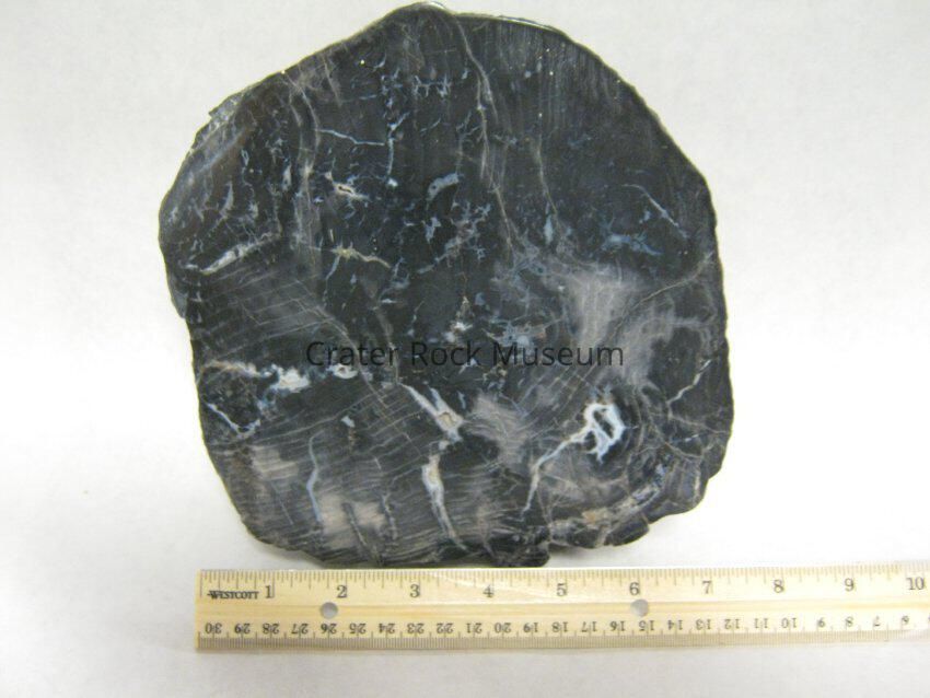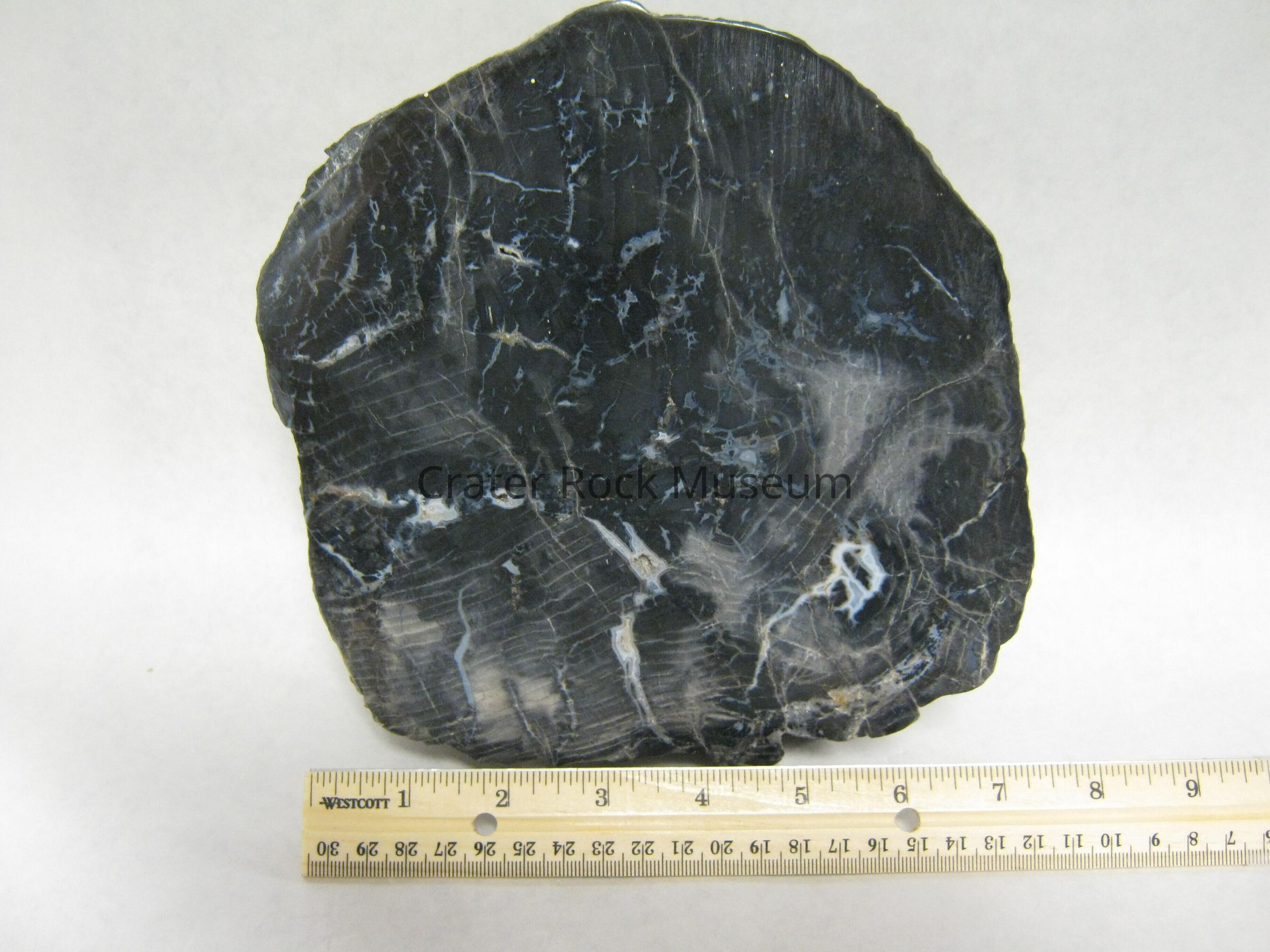 Description: Piece is black with agate seams. Small rays present as well as growth rings.