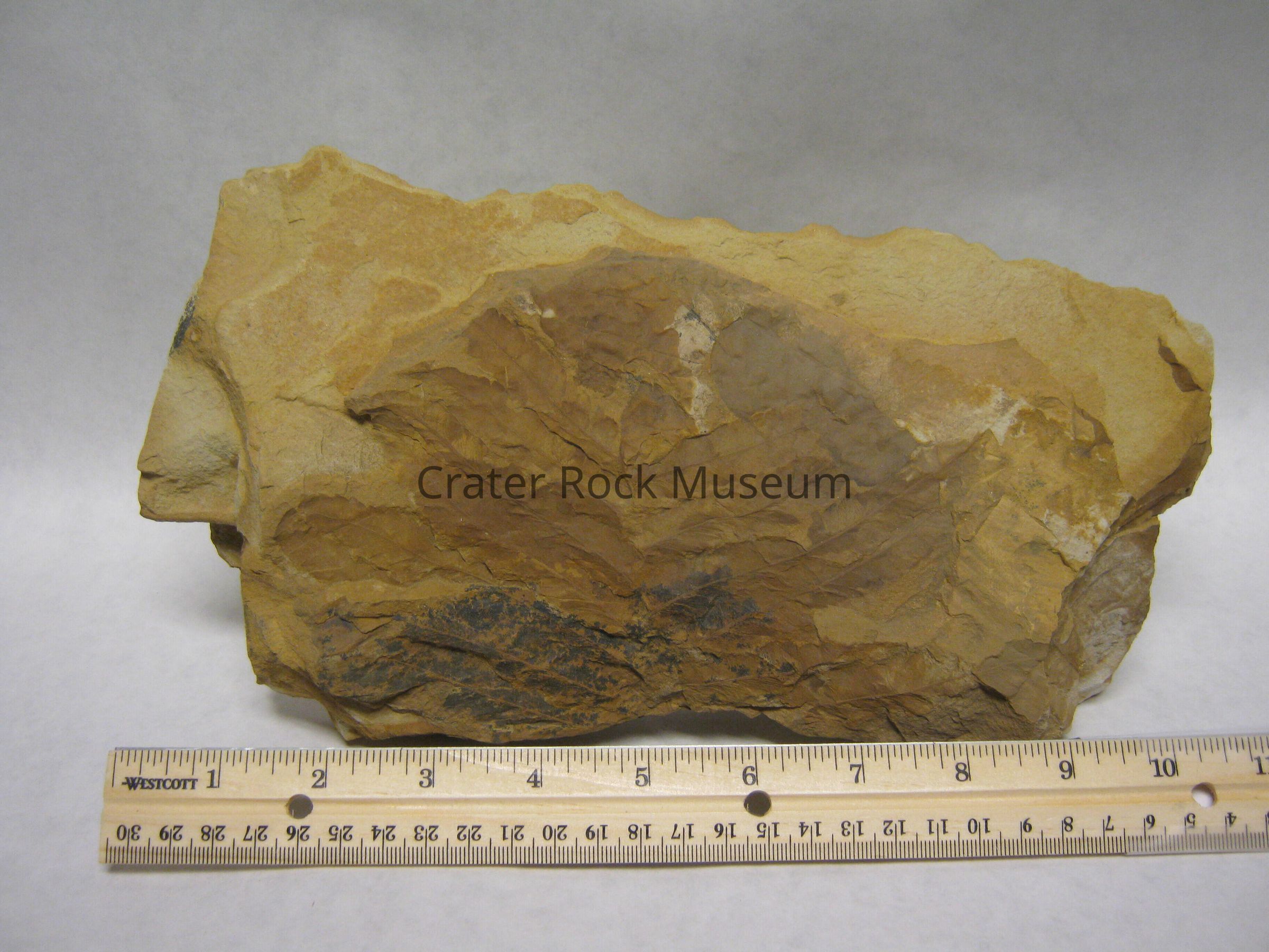Leaf fossils in this case are carbon films that remain on the bedding surfaces of fine-grained sediments. Fossilization happened after the leaves sank to the bottom of a pond or lake and were later buried by additional fine-grained sediments. With burial, the leaves were compressed and the sediment surrounding them solidified. Eventually these fine-grained sediments became shale or mudstone. When all the volatile organic material in the living leaf was pressed out, only a thin carbon residue was left in the sediment, marking the outline and veins of the leaf.