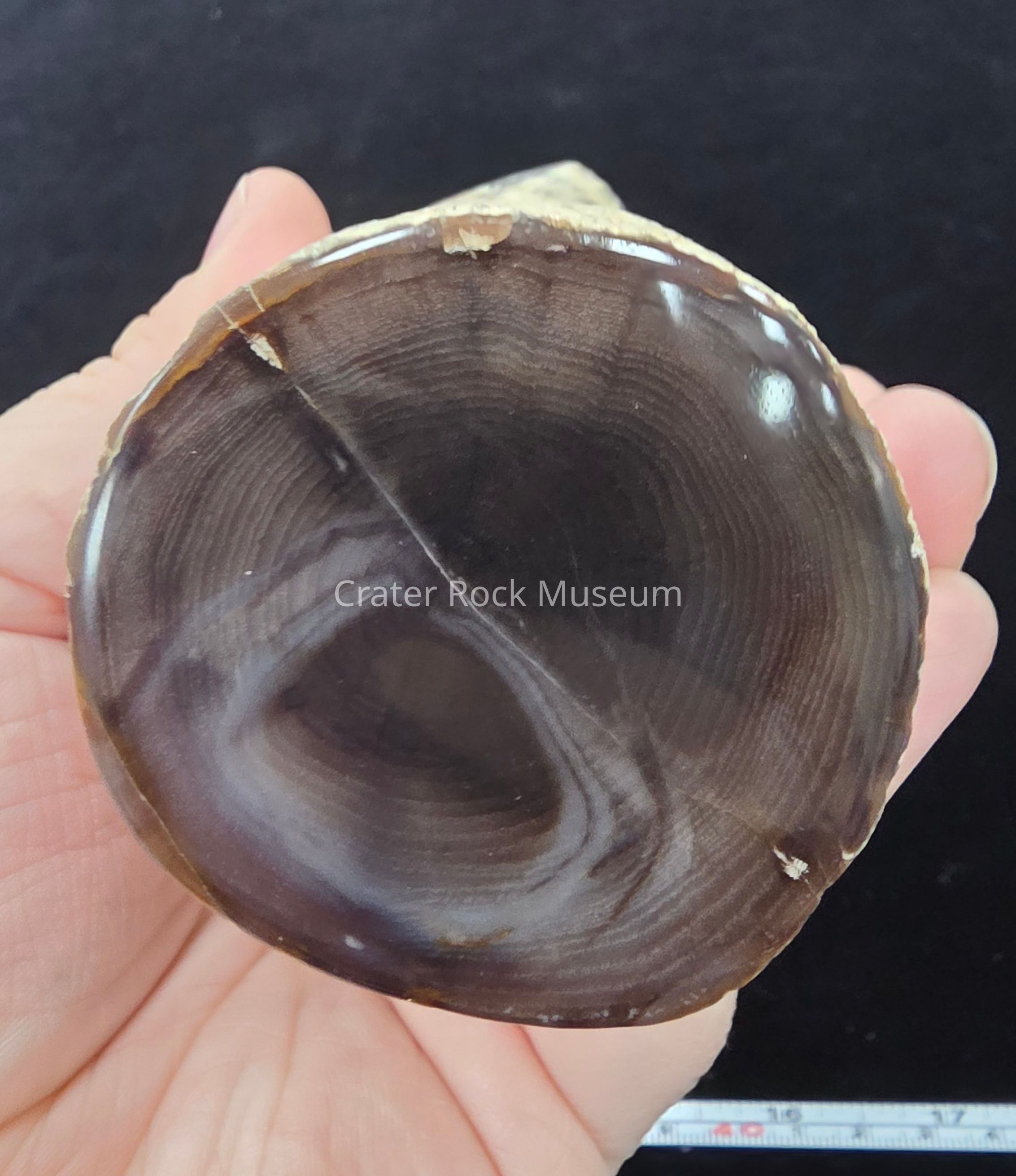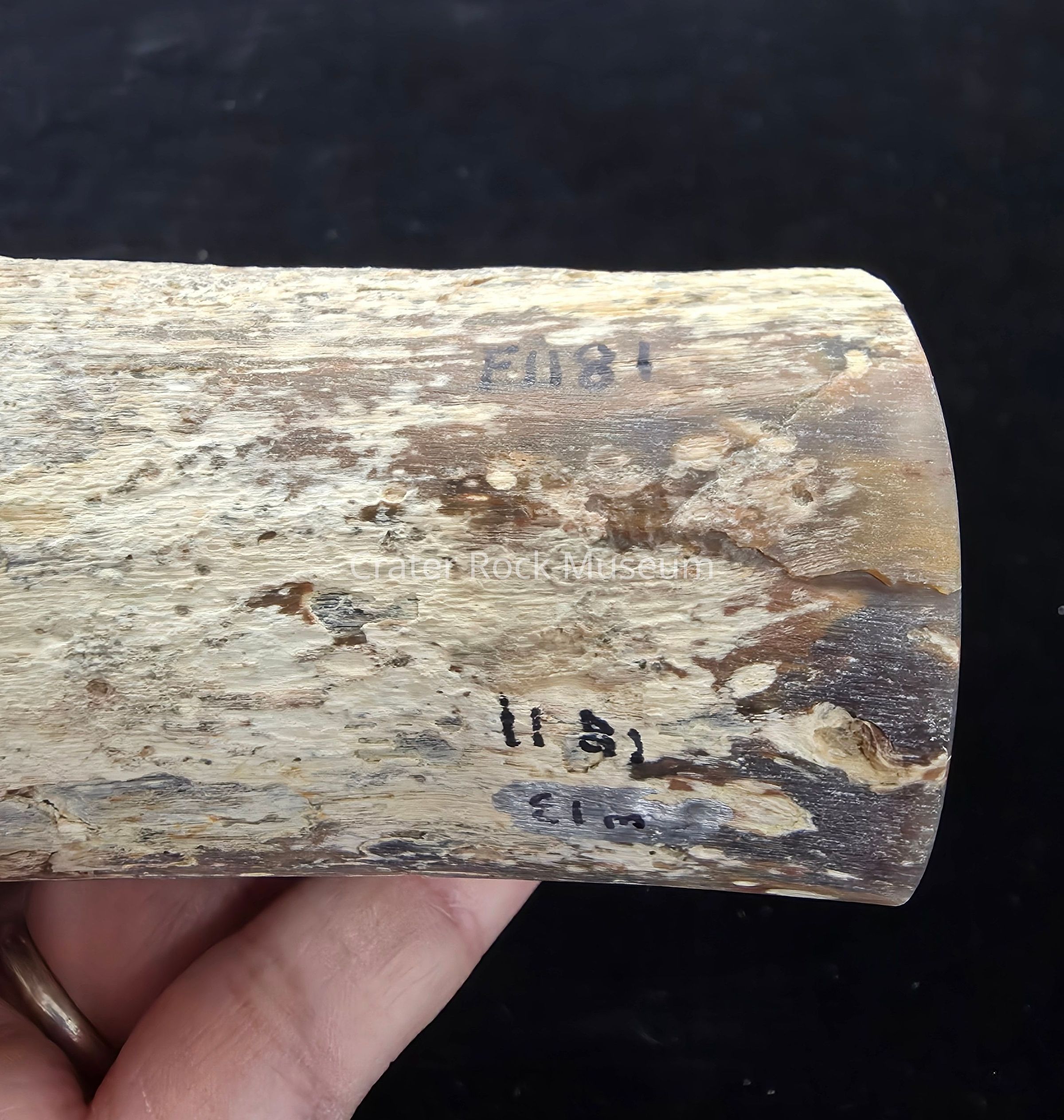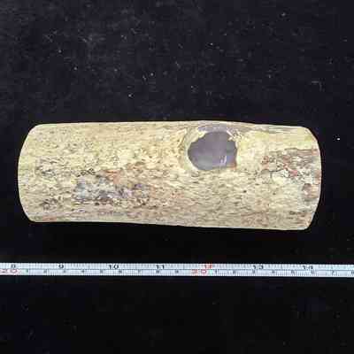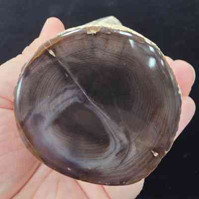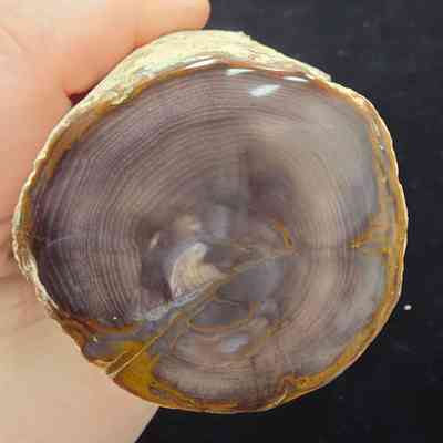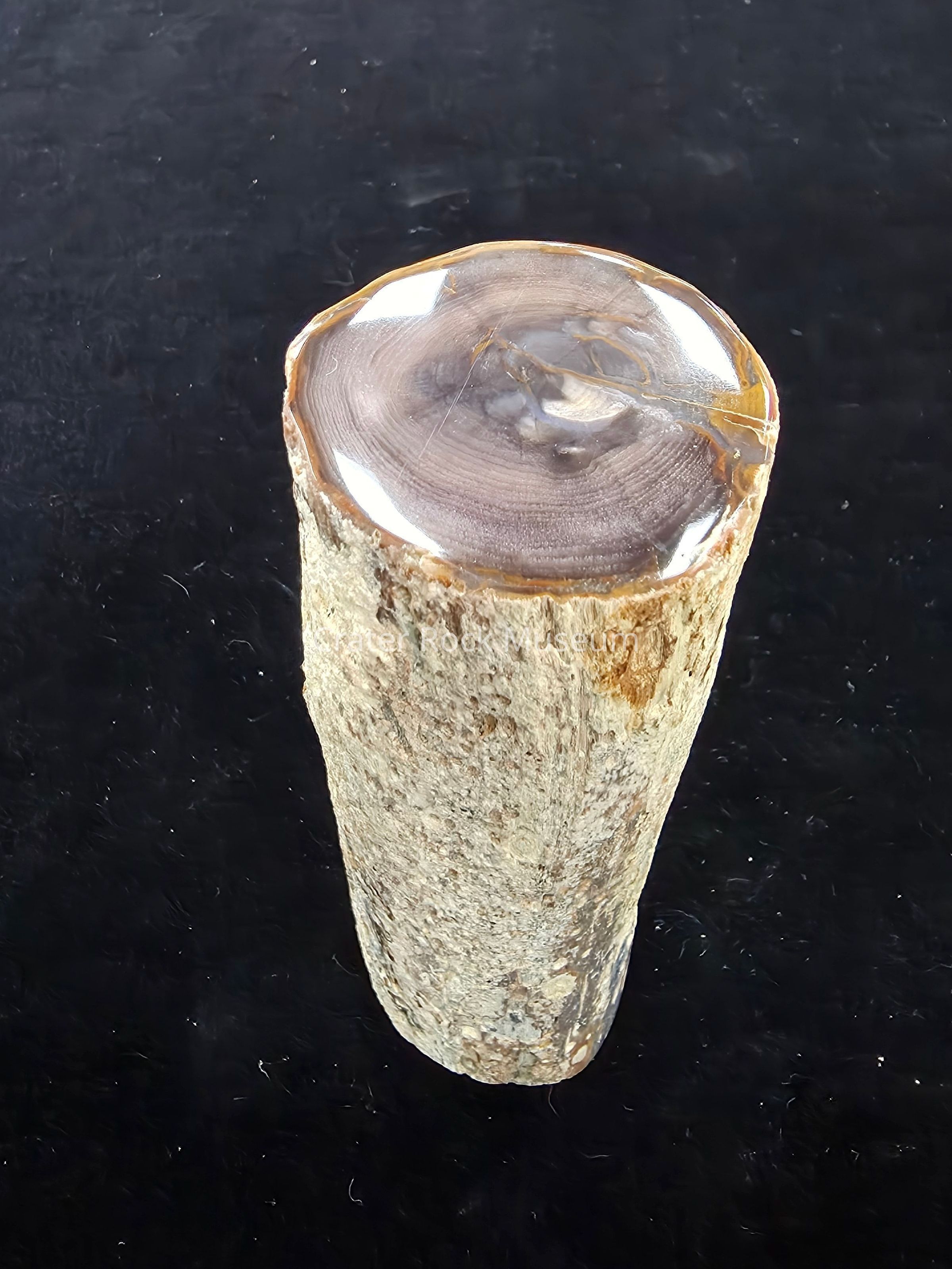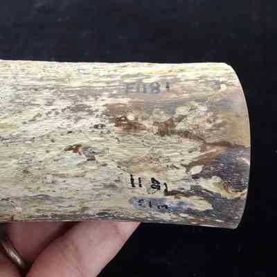 Complete limb showing a single grey-brown face with distinct growth rings on both polished faces; one face is lighter in color. Matrix loss over a circular patch along the long edge.