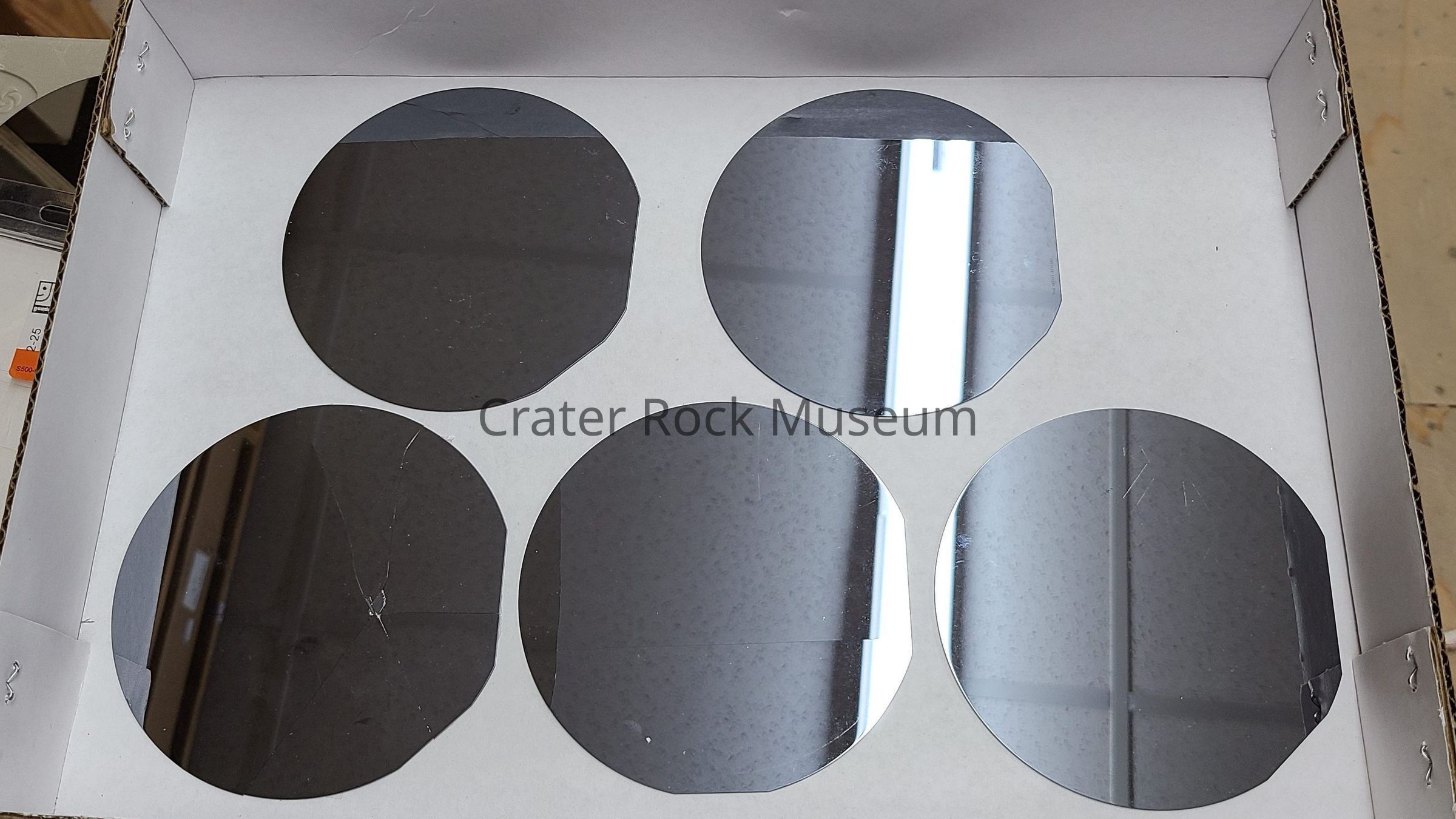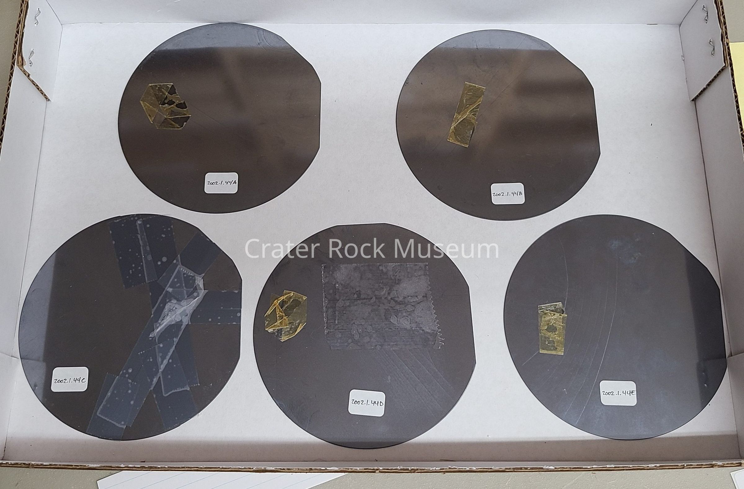 Description: 5 Circular silicon wafers with no etching. Silver-gray in color. All have been previously broken and taped back together in one or more places.