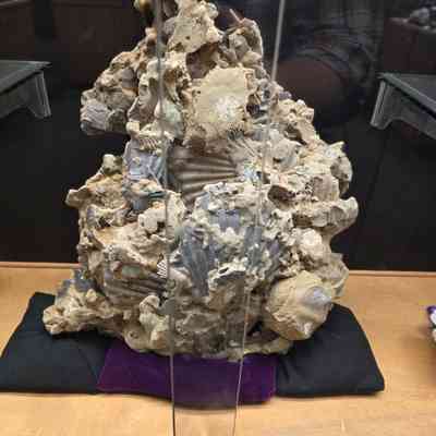 A large multi-layer compaction of Chesapecten shells (gold, grey, and white) on a beige matrix which has been mostly degraded leaving it full of gaps between the fossils.