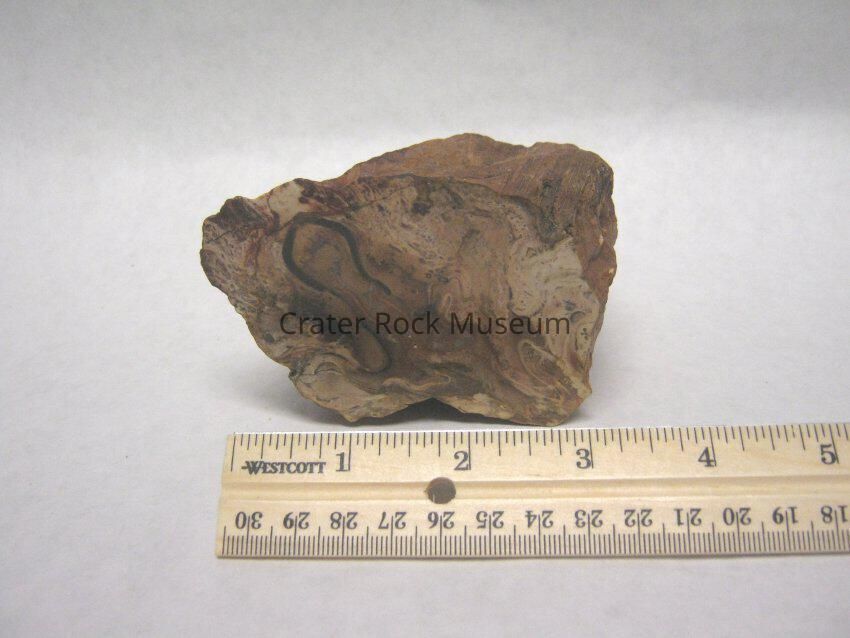 Description: A complete round stalk from the fern similar in appearance to a limb cast, polished end shows swirls of brownish-rust, tans and beige colors, the outer side is a reddish-brown bark-like.
