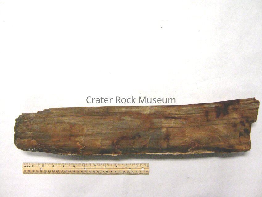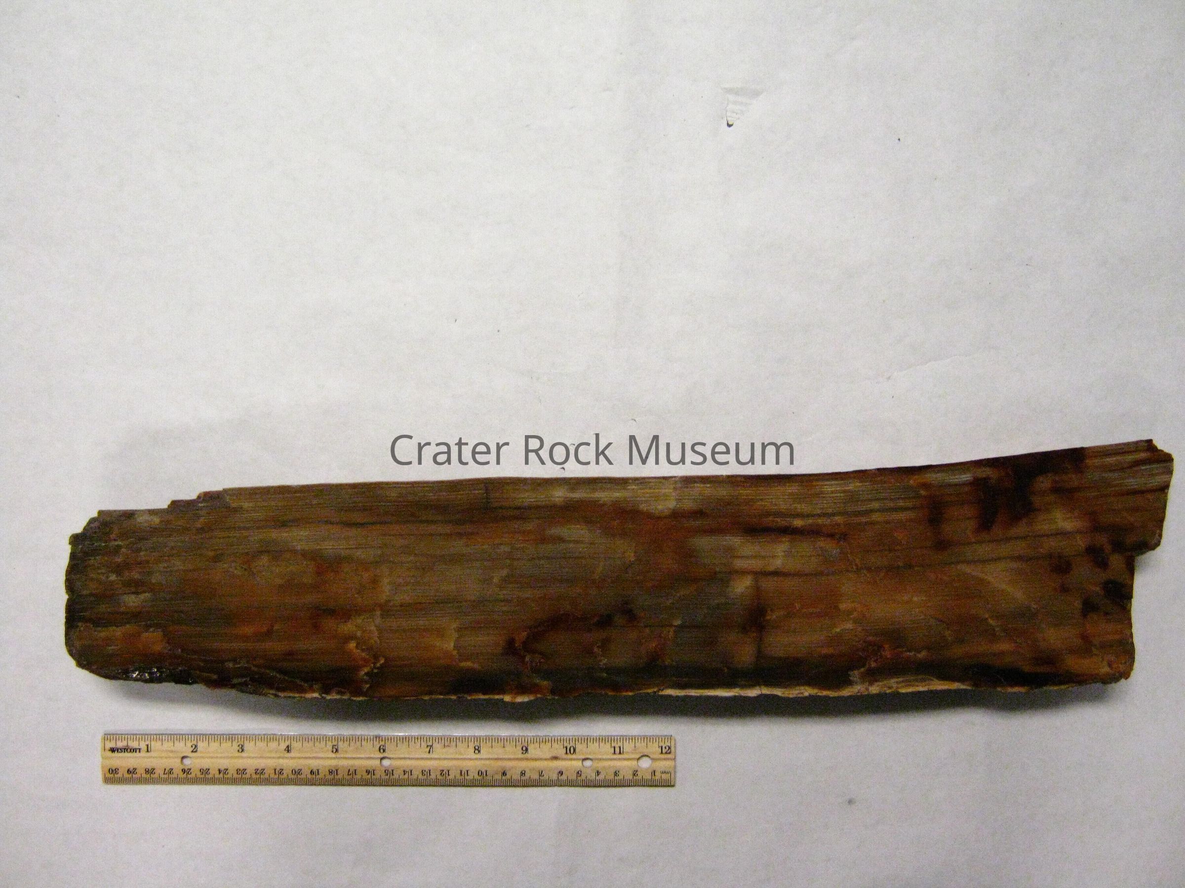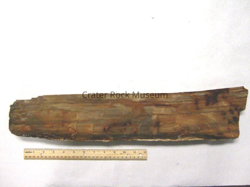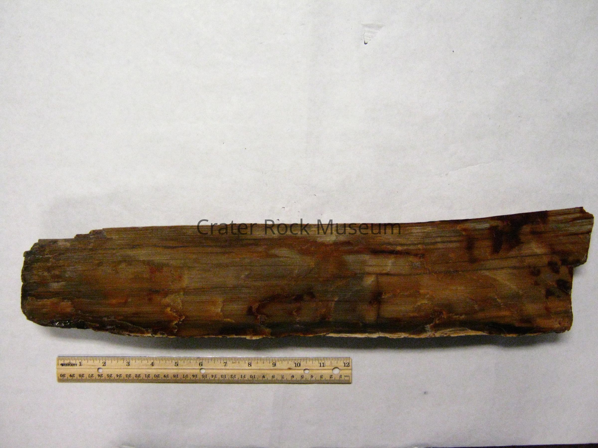 Description: Cut longitudinally polished face shows colors of tan, beige, rust and brown, woods grain is apparent, outer side shows a woody bark appearance with colors beige, brown and rust.