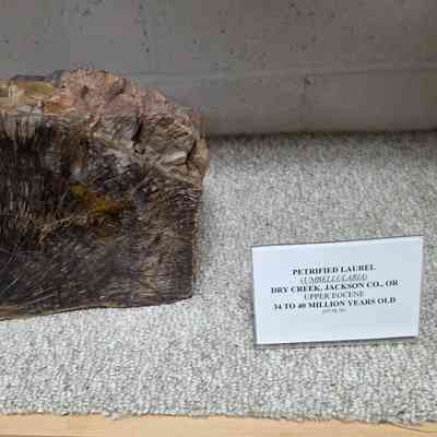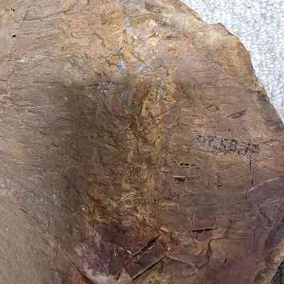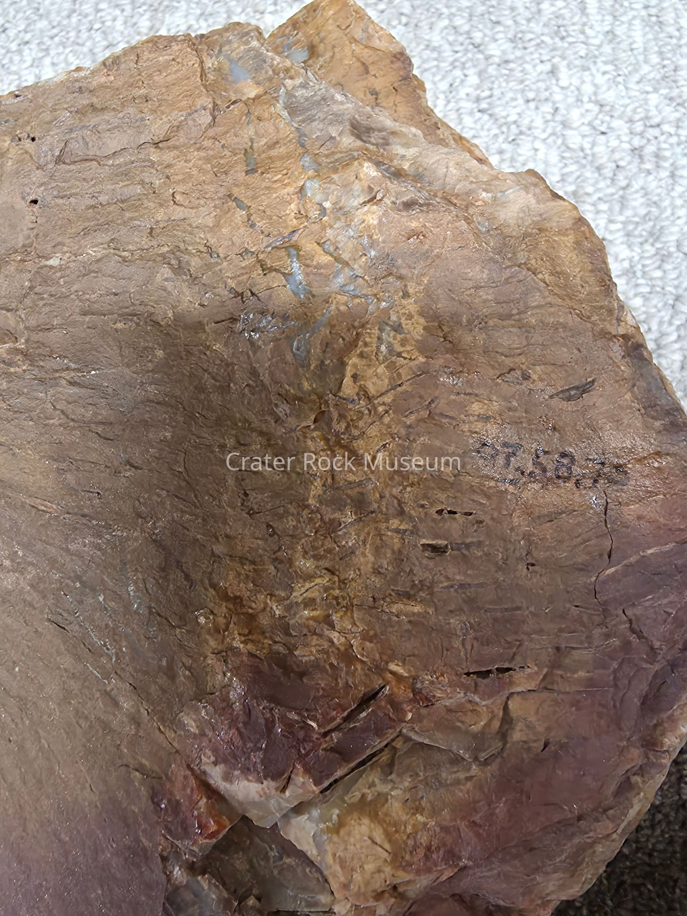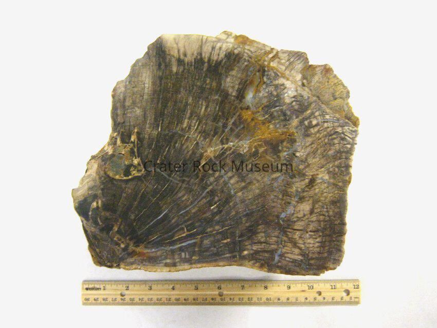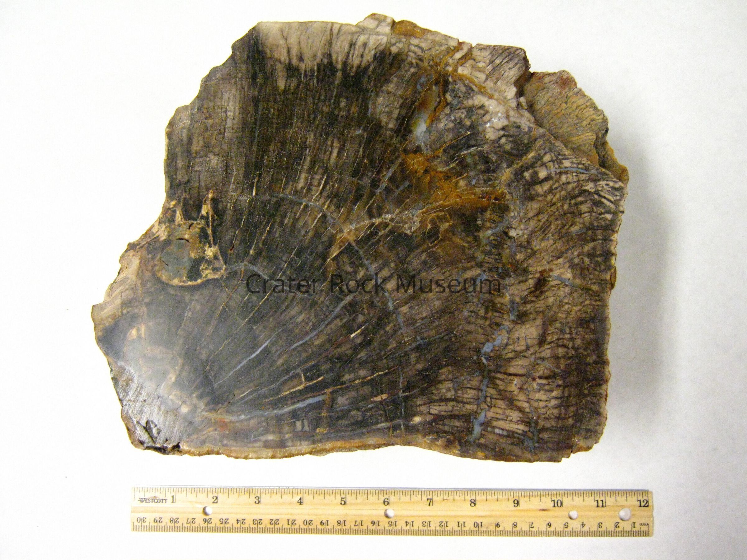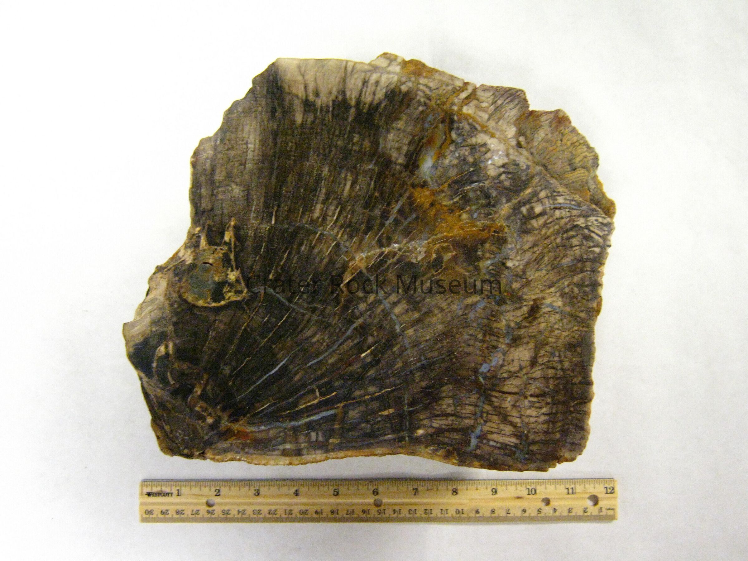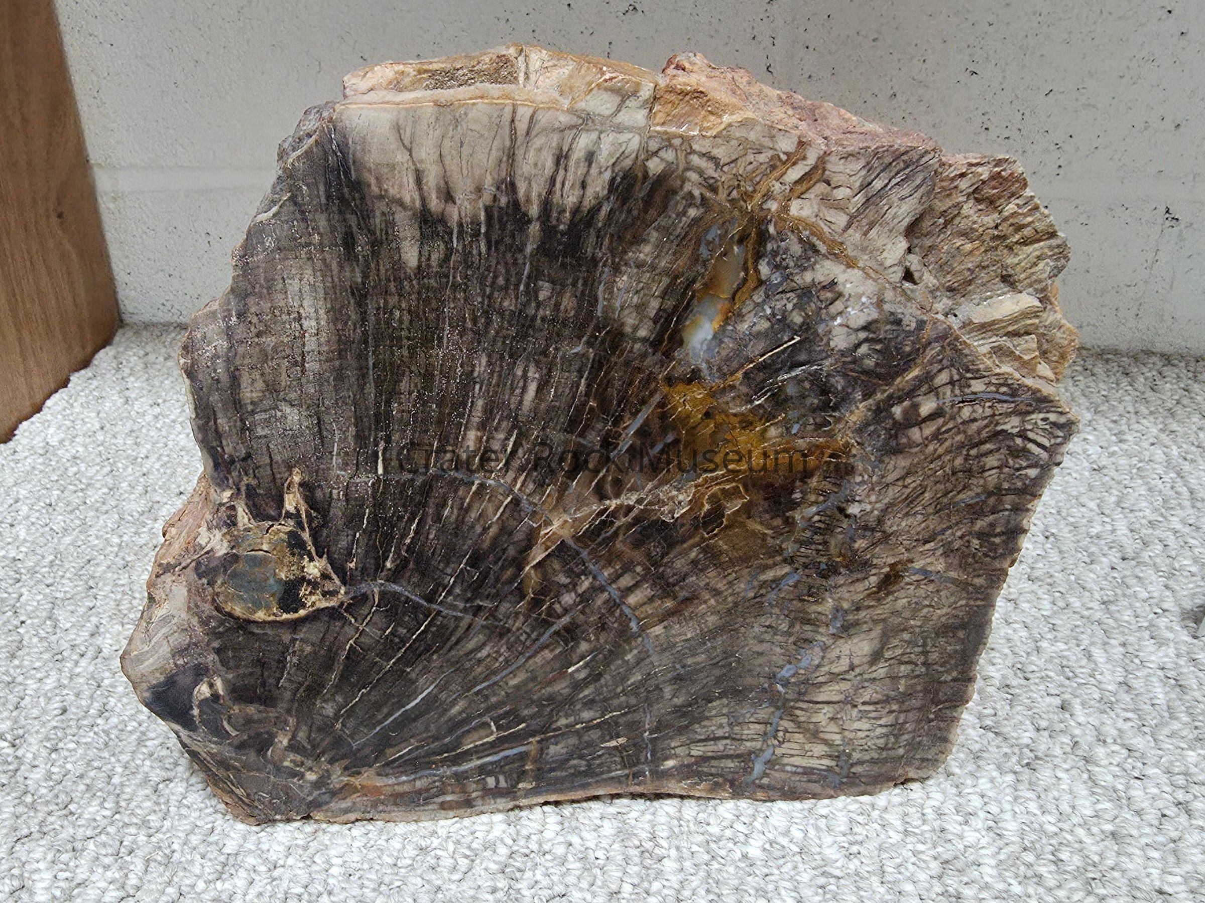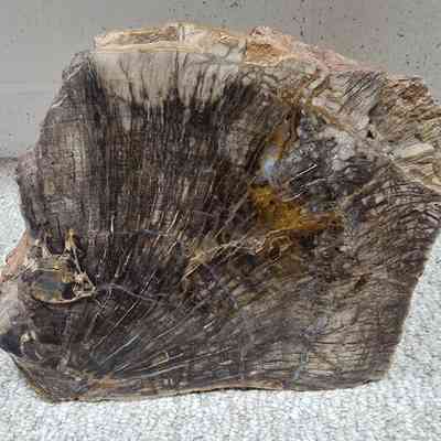 Description: Stump not a complete round the polished face shows colors of browns to beiges with agate running through the cracks, woods grain is apparent and rays. The outer side is colored brown to rust with a crystaline side.