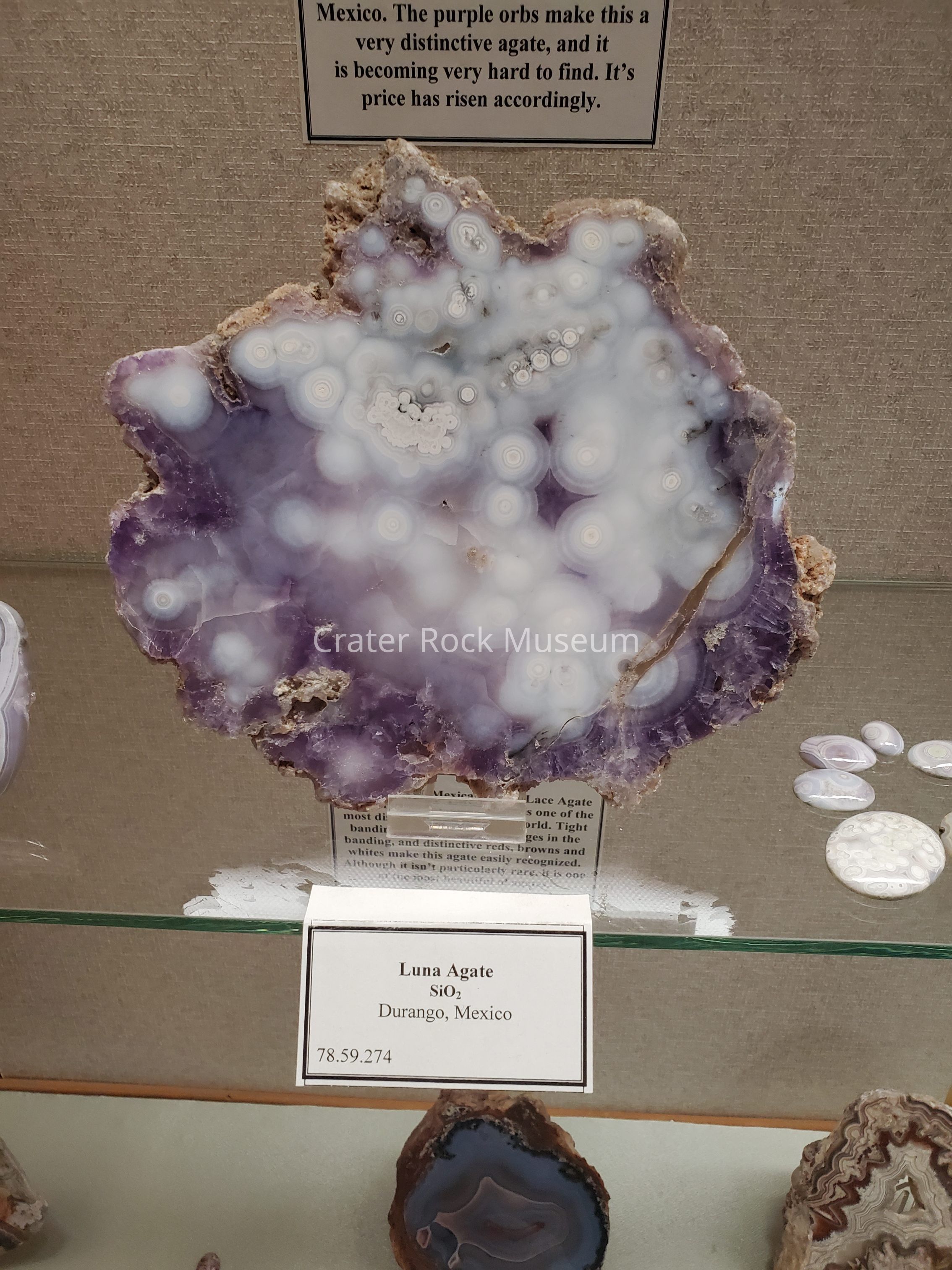 A slice of Amethyst Agate varying in thickness from Durango, Mexico. Amethyst color is caused by Quartz mixing with Manganese ore. Colors: Numerous Opaque Eyes in White with semitransparent White, Halos are in a purple Crystalline rock. There are numerous cracks, some surfaces.Dimensions