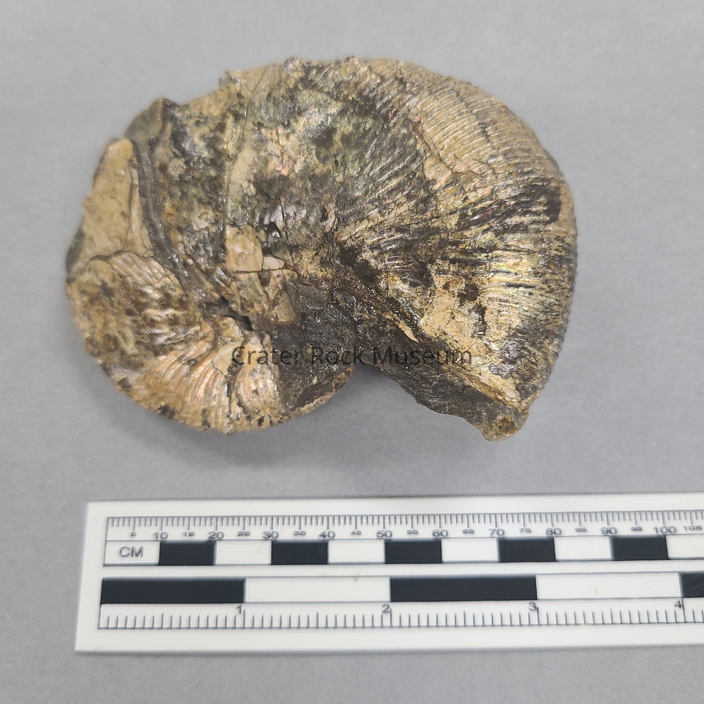 Coiled ammonite that has is partially opalized. Tan, grey, and a bit of green.