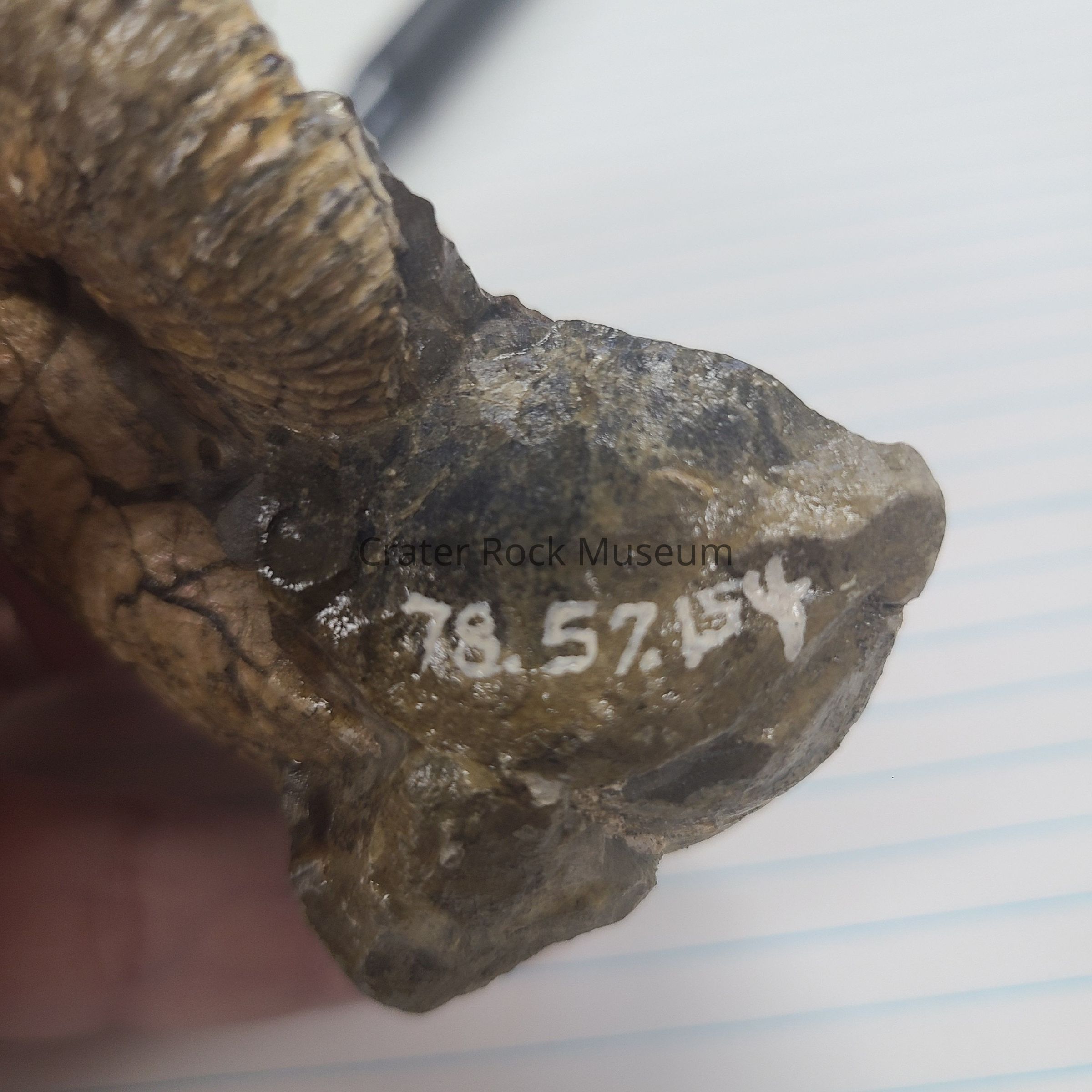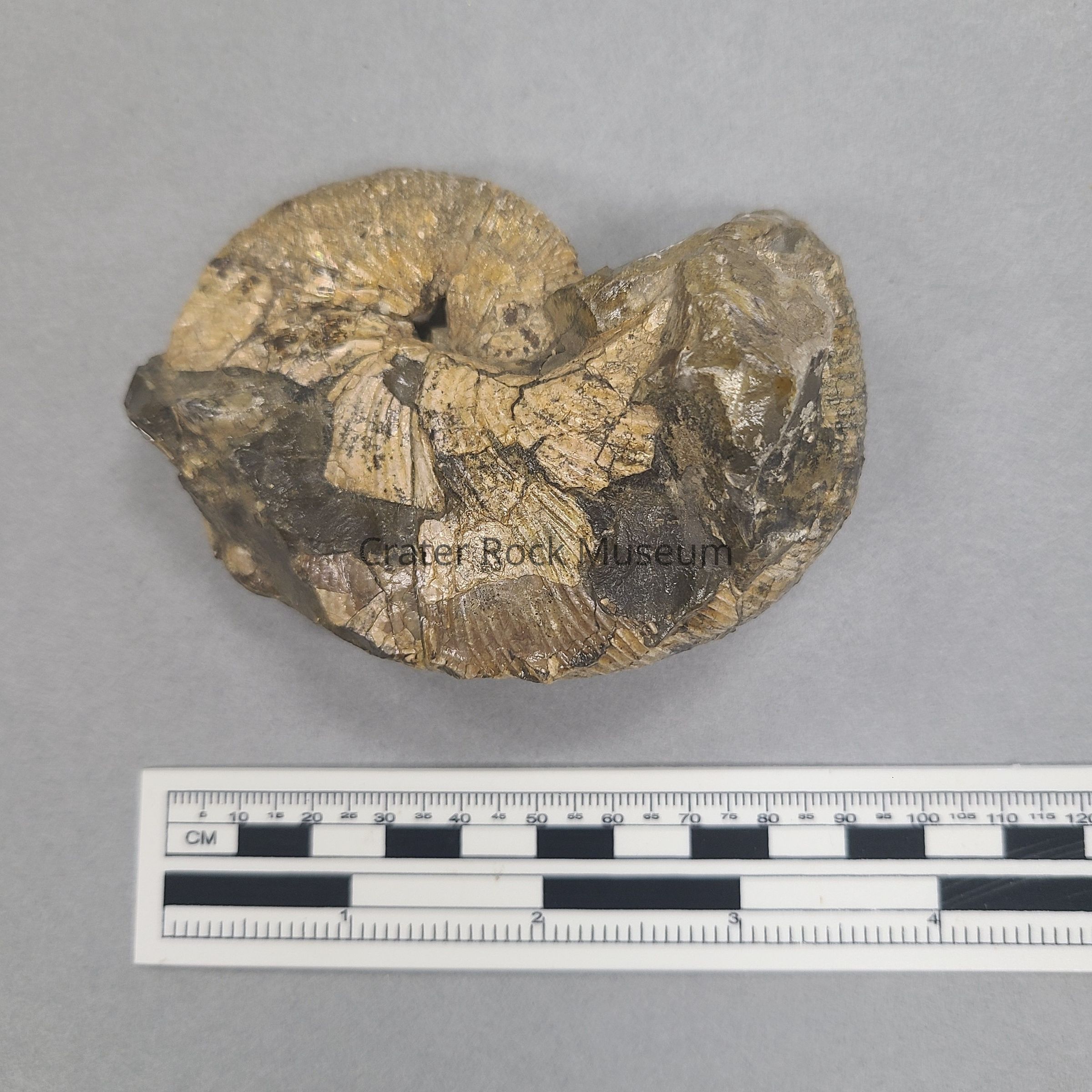 Delmar description: "One Scaphite which is a partly uncoiled ammonite of the phylum Mollusca. Class: Cephalopoda. Sub class: Ammonoidea. A flattened spiral coil with the inner whorls in contact. The last one is free. Has external ridges and mother-of-pearl coating. Found in Kansas."Collection