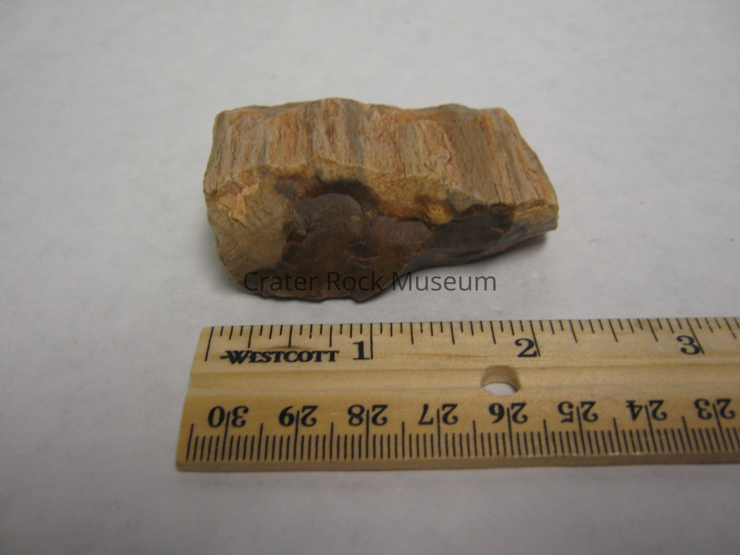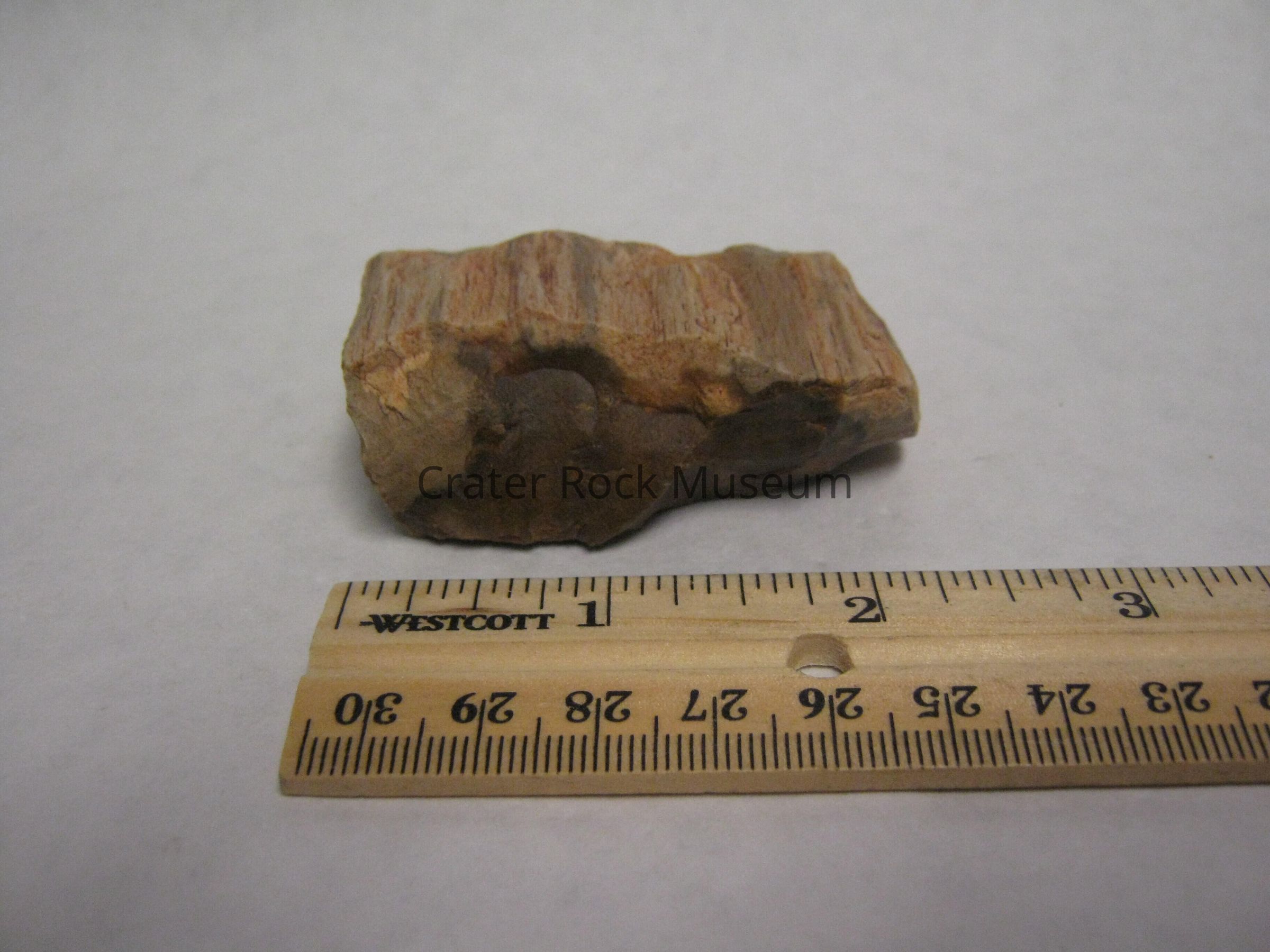 Description: This specimen is a rusty-brownish, tan chunk of petrified wood which is believe to have been chipped by Native Americans in the making of some type of tool or arrow head.