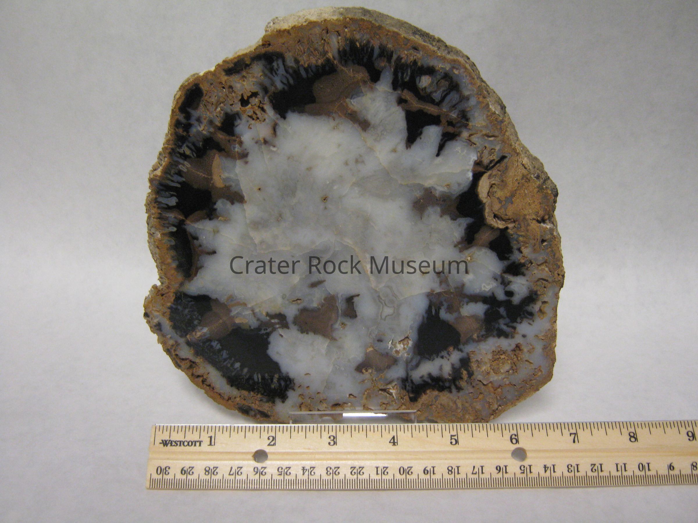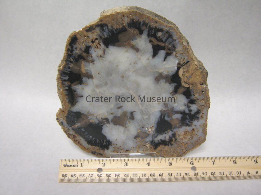 Description: A 5/8" thick slice of a petrified palm stump from Roxy Ann in Jackson County Oregon. Polished side shows a center of white and grey agate going out to browns and blacks with the outer matrix is tan and porous.