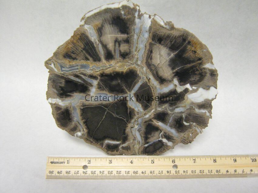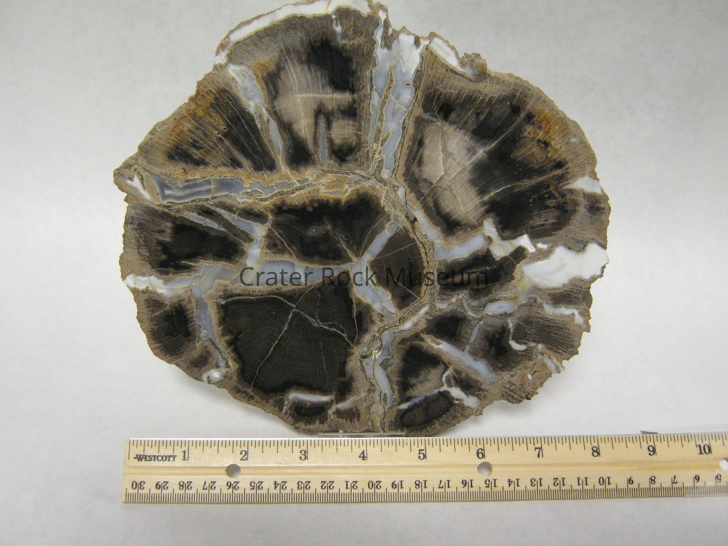 Description: Delmar 's Description: A 3/4" thick slice of a petrified wood from Long Mountain in Eagle Point, Jackson County Oregon. Polished side shows wood in dark browns, black and beiges with some orange staining. Numerous Grey and white silicate (agate) cracks. Piece has been broken and glued back together.