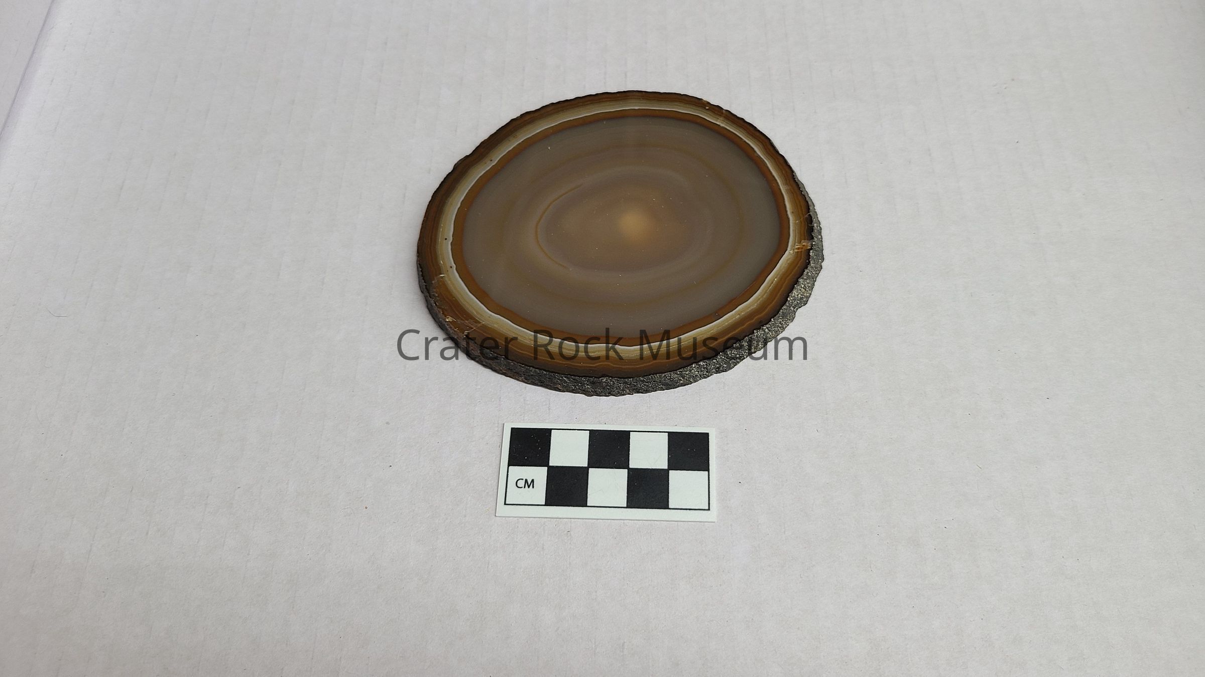 A 3/8" (.9 cm) thick slice of an Agate from Brazil. Polished side shows fortified Agate in Greys, Tan, Orange, White and Brown, Black at outer edge. Open Crystalline hole on unpolished side. Outer edge was broken in numerous pieces and glued back together.Dimensions