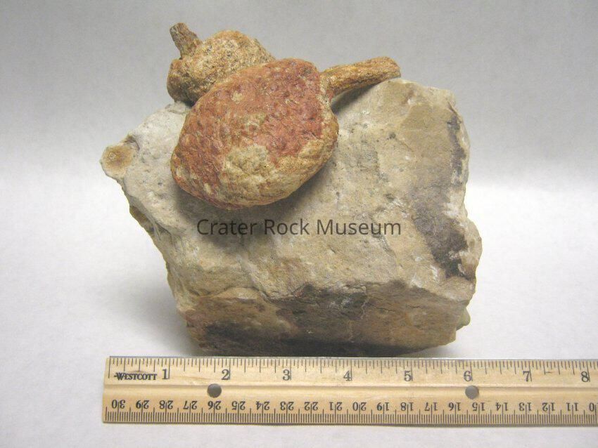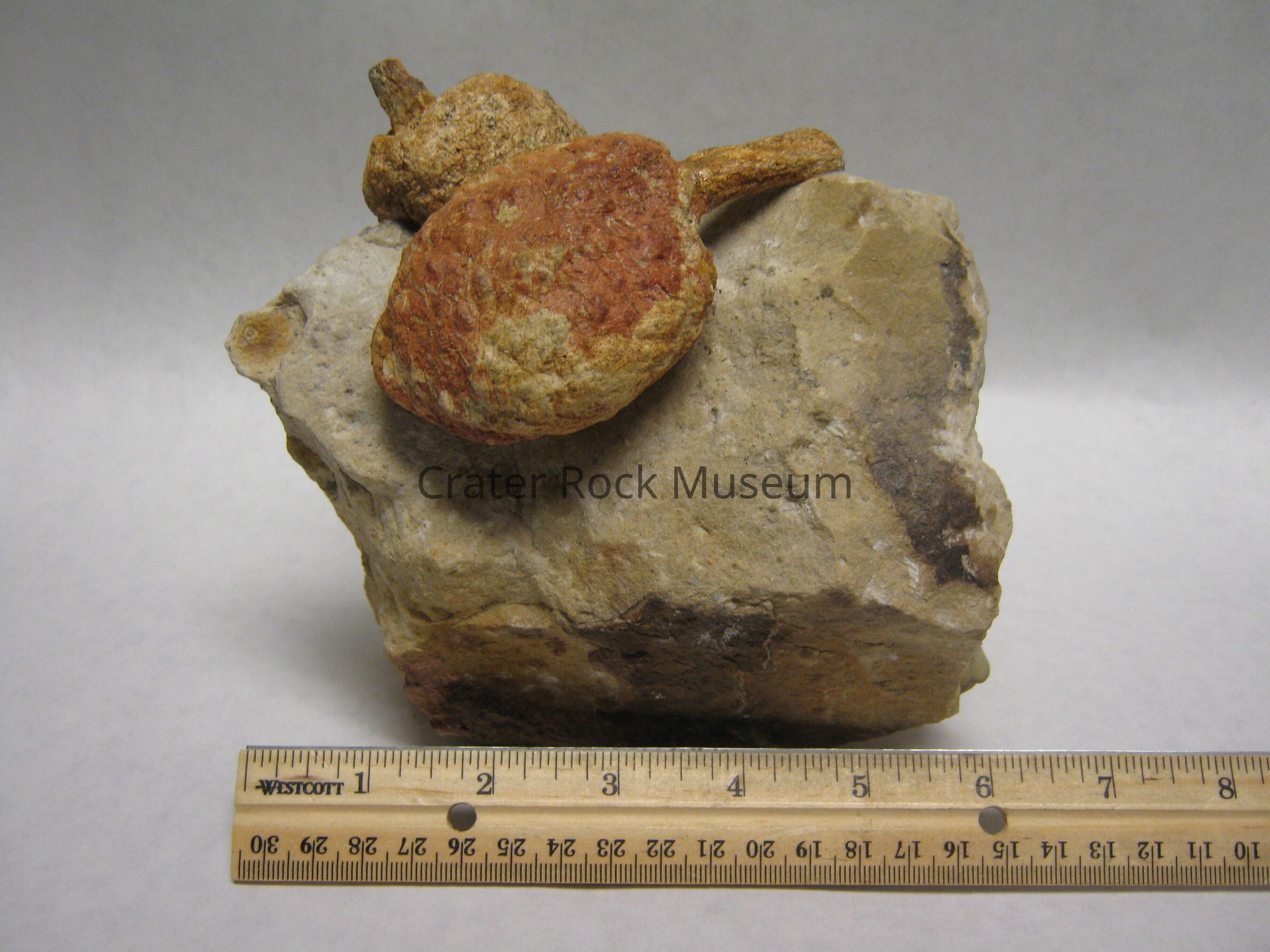 2 cones of the species Araucaria mirabilis in the matrix of a beige sandstone matrix. The cones are rusty-tan in color.