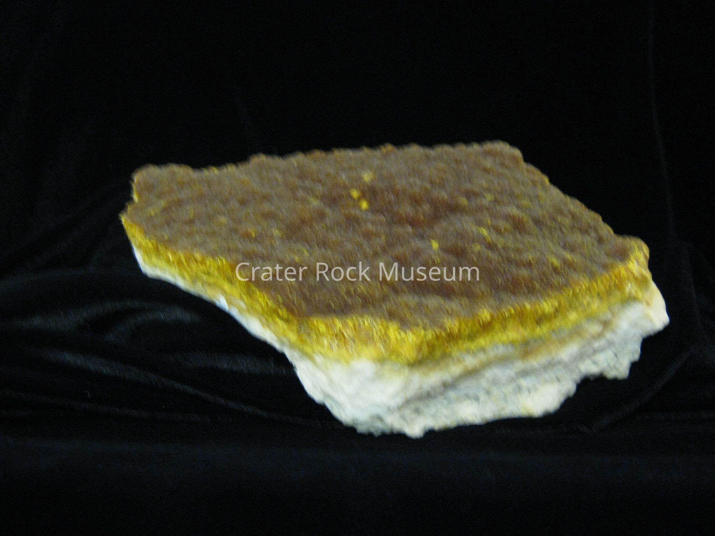 Description: Thick white matrix base the orpiment crystal are the golden layer on top