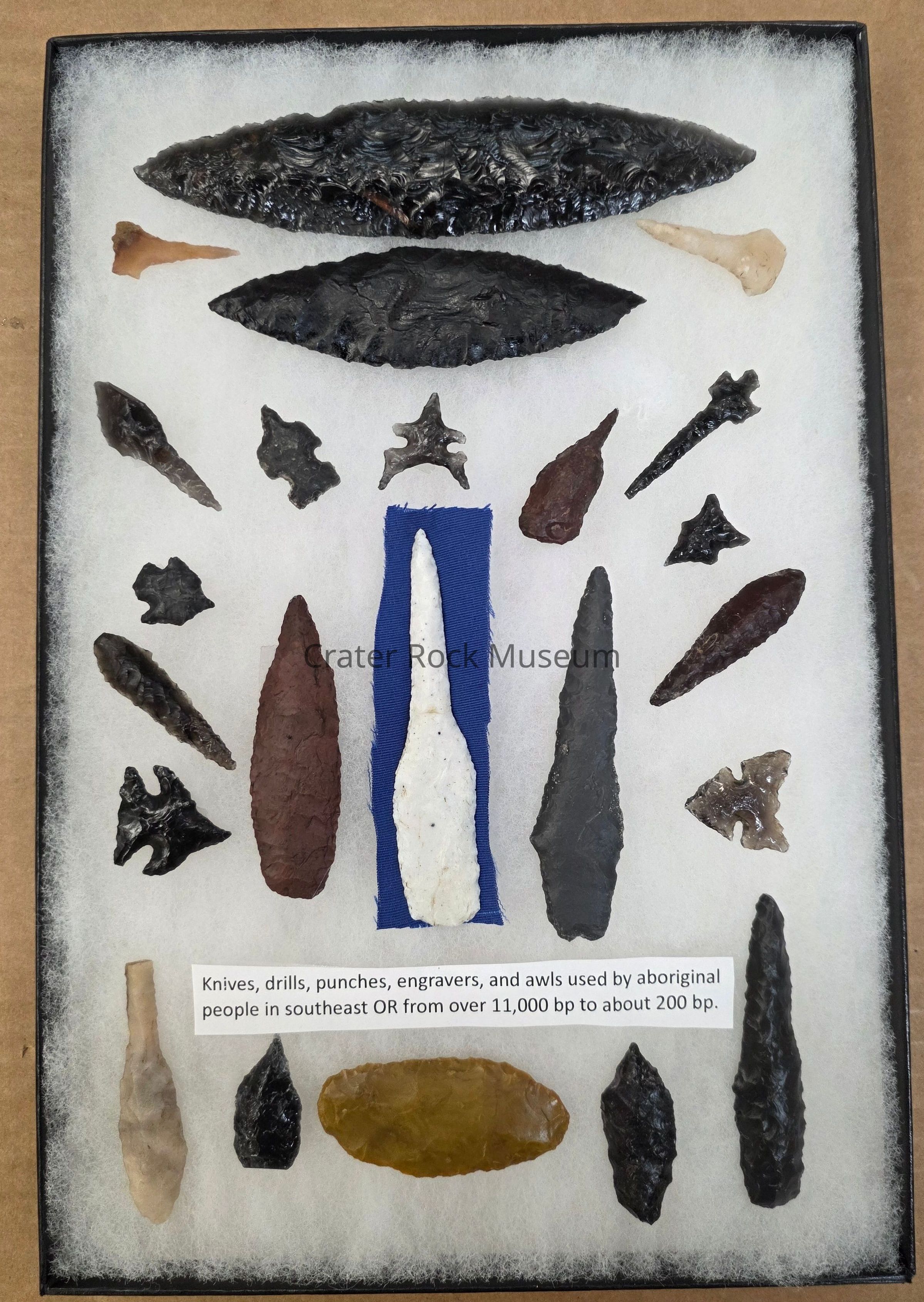 23 obsidian and jasper tools in an 8"x12" Riker frameCollection