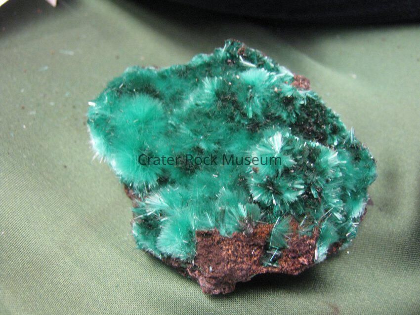 Variety: Brochantite is similar to other fibrous green copper minerals that form in oxidation zones such as the carbonate mineral malachite, the halide mineral atacamite and the closely related sulfate mineral antlerite. This brings up a number of identification problems. Acicular malachite will effervesce in warm hydrochloric acid and brochantite will not. Atacamite is slightly softer and is usually less transparent. Antlerite is all but indistinguishable by ordinary means although its terminations are typically flatter than the rounded terminations of brochantite.Collection