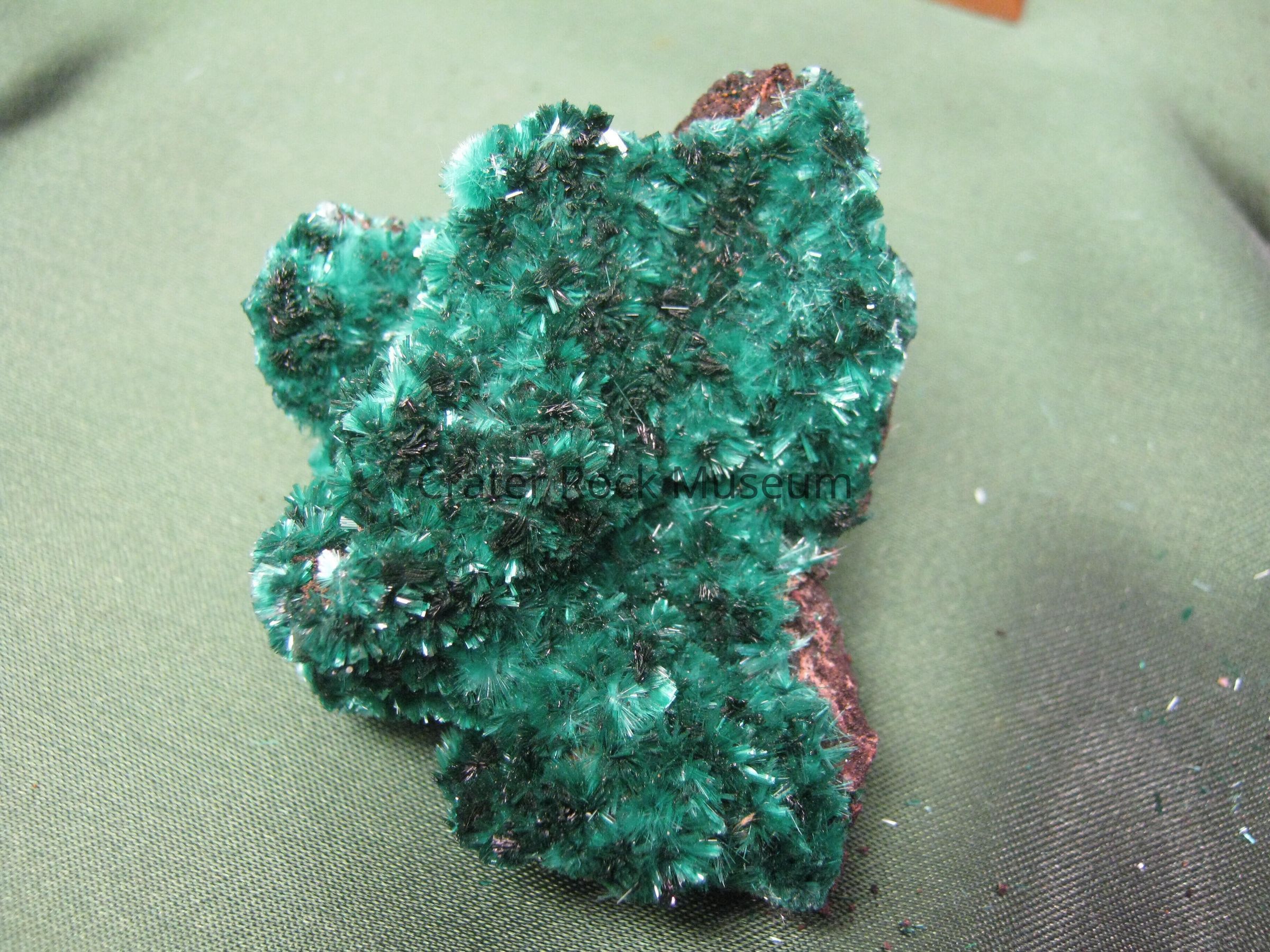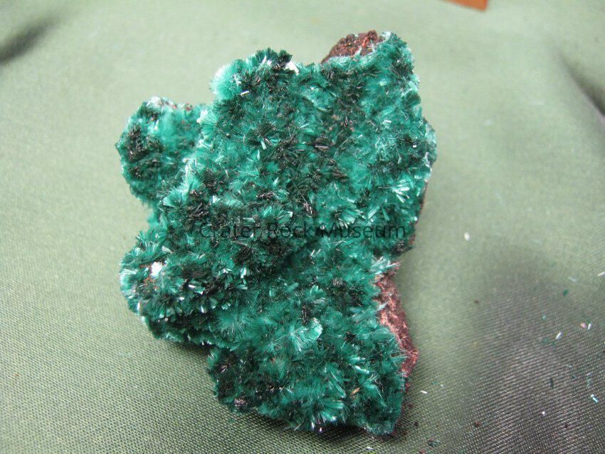 Variety: Brochantite is similar to other fibrous green copper minerals that form in oxidation zones such as the carbonate mineral malachite, the halide mineral atacamite and the closely related sulfate mineral antlerite. This brings up a number of identification problems. Acicular malachite will effervesce in warm hydrochloric acid and brochantite will not. Atacamite is slightly softer and is usually less transparent. Antlerite is all but indistinguishable by ordinary means although its terminations are typically flatter than the rounded terminations of brochantite.Collection