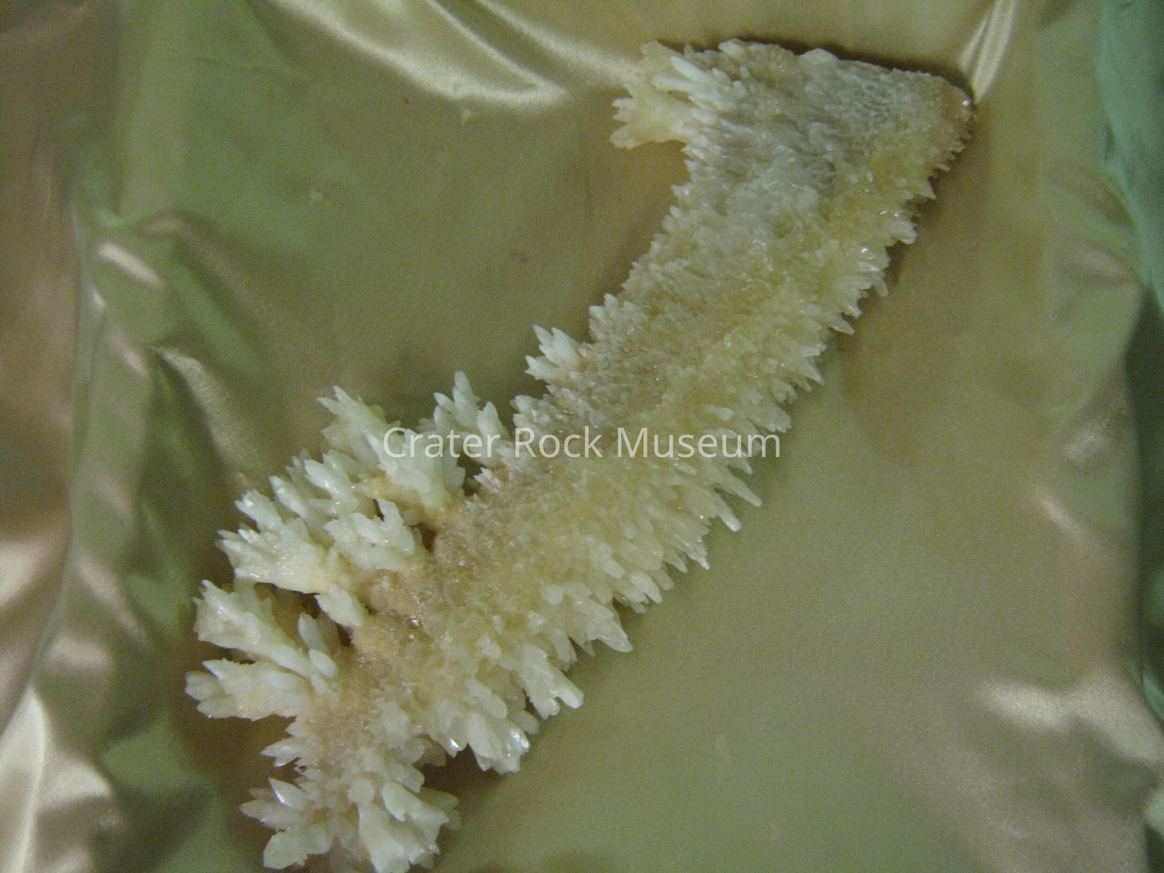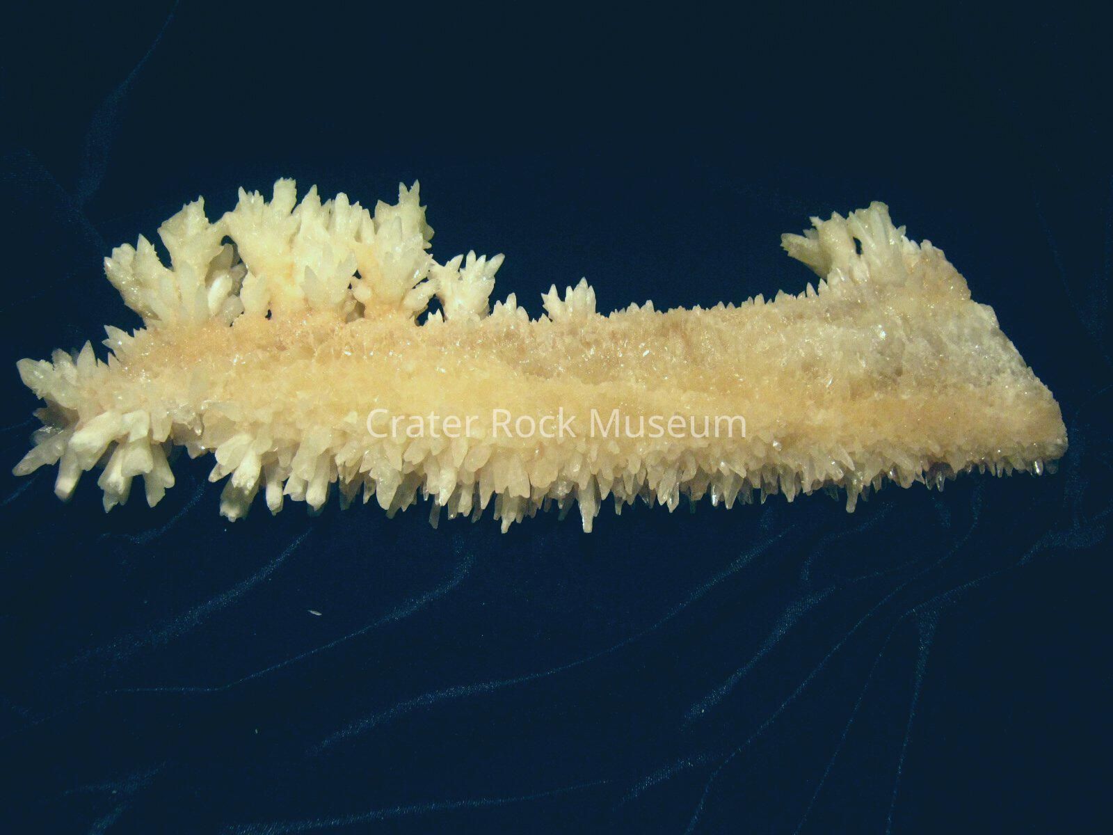 Not necessarily a variety of calcite, cave formations are certainly a unique aspect of calcite's story. Calcite is the primary mineral component in cave formations. Stalactites and stalagmites, cave veils, cave pearls, "soda straws" and the many other different cave formations that millions of visitors to underground caverns enjoy are made of calcite. It is the fact that calcite is readily dissolved that these formations occur. Overlying limestones or marbles are dissolved away by years and years of slightly acidic ground water to percolate into the caverns below. In fact the caverns themselves may have been the result of water dissolving away the calcite rich rock. As the calcite enriched water enters a relatively dry cavern, the water starts to evaporate and thus precipitate the calcite. The resulting accumulations of calcite are generally extremely pure and are colored if at all, by very small amounts of iron or other impurities.