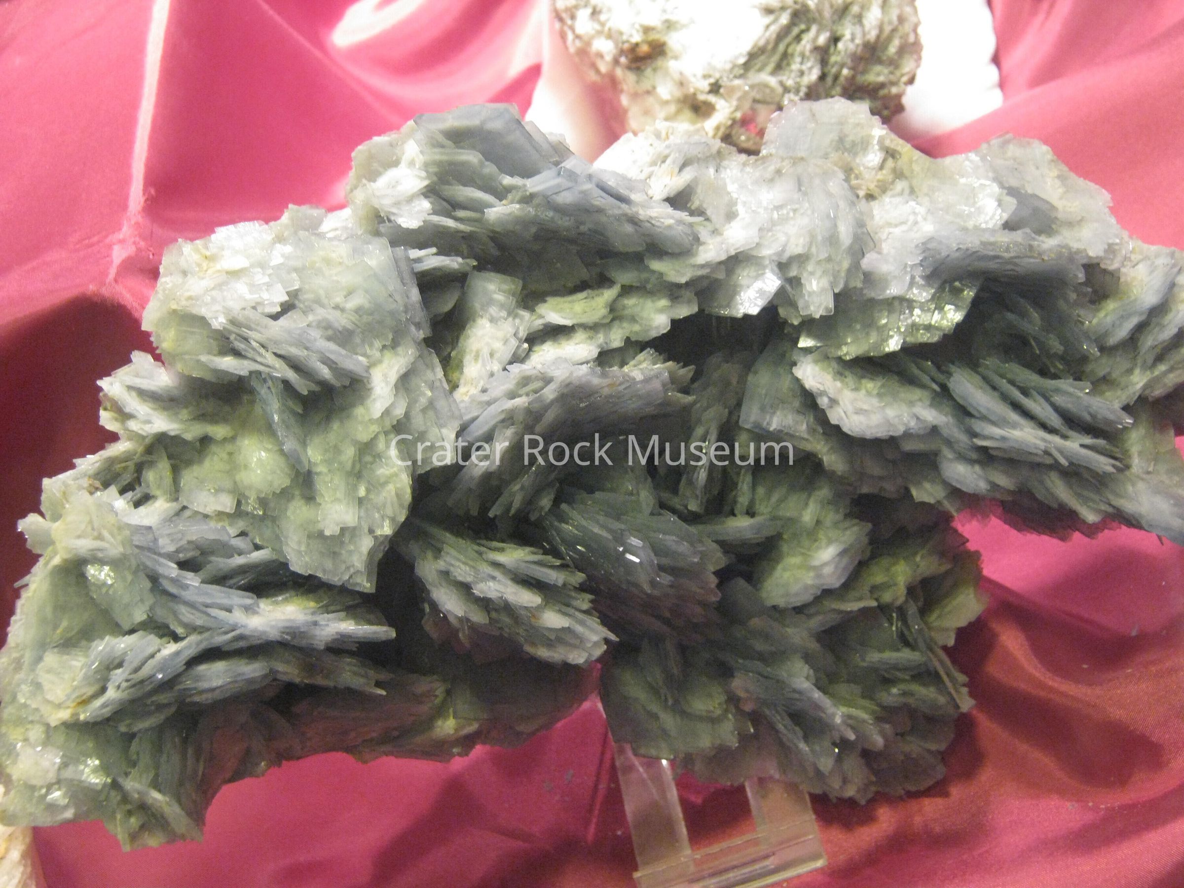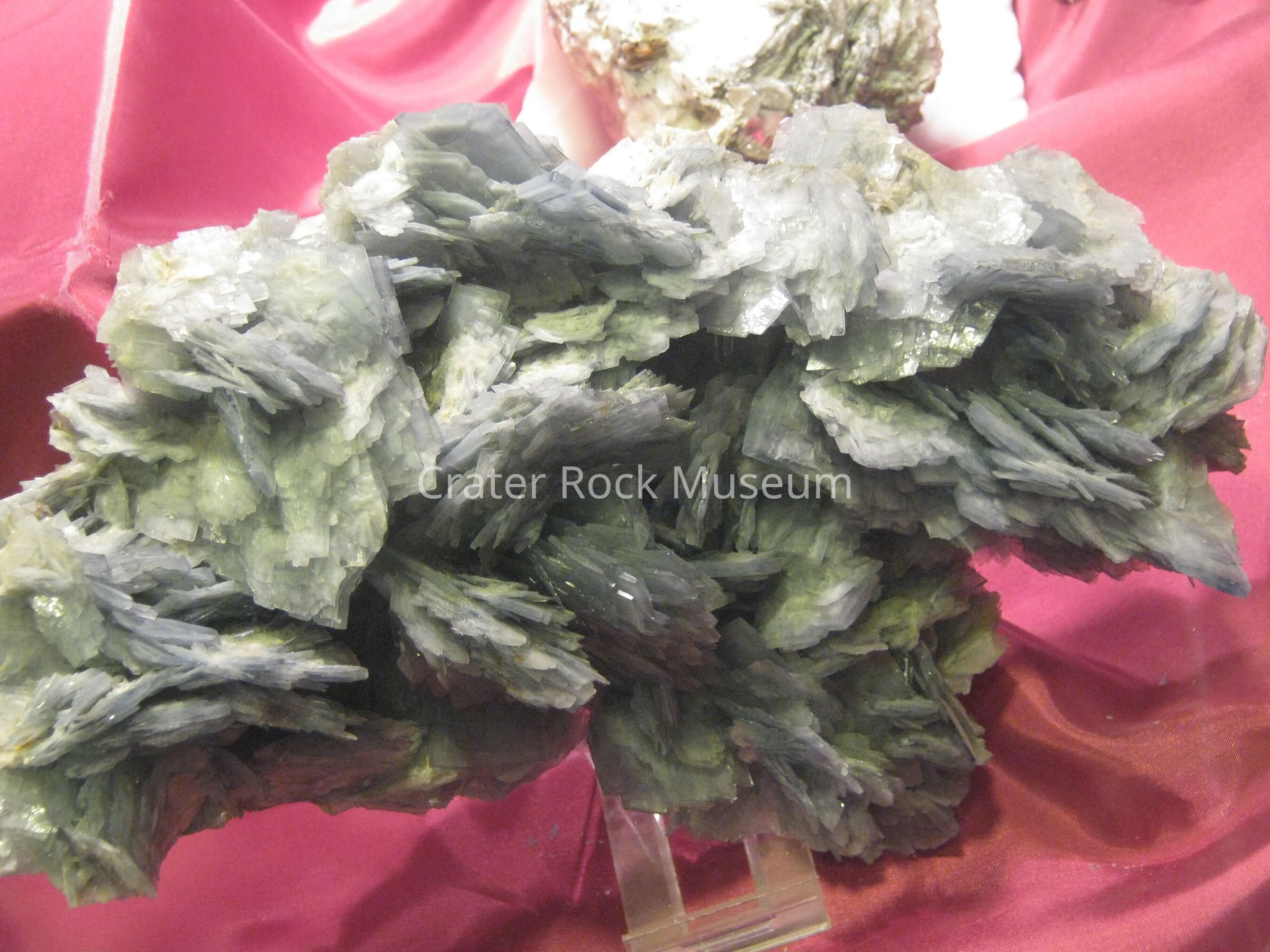 Variety: Barite is a common mineral and makes very attractive specimens. It often is an accessory mineral to other minerals and can make a nice backdrop to brightly colored crystals. At times bladed or tabular crystals of Barite form a concentric pattern of increasingly larger crystals outward. This has the appearance of a flower and when colored red by iron stains, these formations are called "Desert Roses". Because Barite is so common, it can be confused for other minerals. Celestite (SrSO4) has the same structure as barite and forms very similar crystals. The two are indistinguishable by ordinary methods, but a flame test can distinguish them. By scrapping the dust of the crystals into a gas flame the color of the flame will confirm the identity of the crystal. If the flame is a pale green it is barite, but if the flame is red it is celestite. The flame test works because the elements barium (Ba) and strontium (Sr) react in the flame and produce those colors.Collection