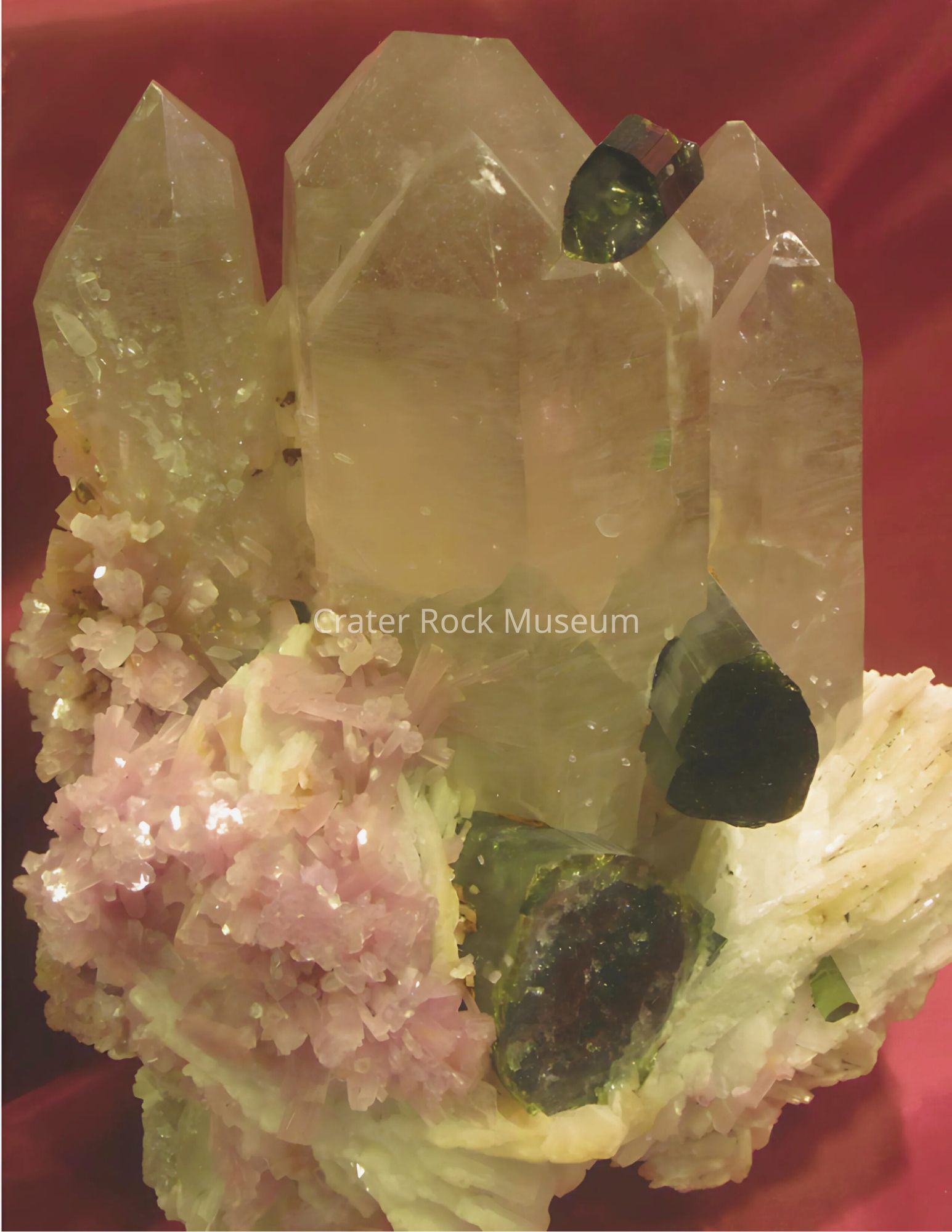Description: Pointed top tower crystals with cylender shaped green crystals and thing cylender shaped pink crystals.