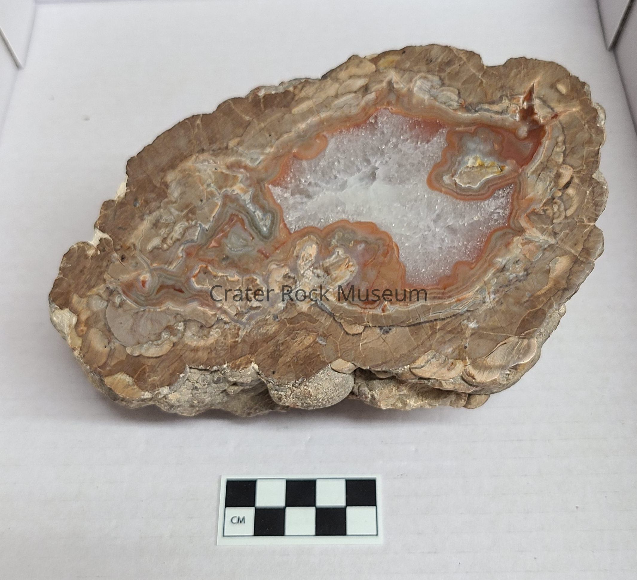 Two Thundereggs from Deming, NM. Cut sides show Crystalline centers (White on one and Grey on the other) surrounded by fortified Agate in Red Pink, Grey and Greenish and Lavender on one with Grey, Pink and Cream Agate area in Crystalline_____________, surrounding rock is in Pinkish Grey, Grey and Beige. Pieces vary in size.Dimensions