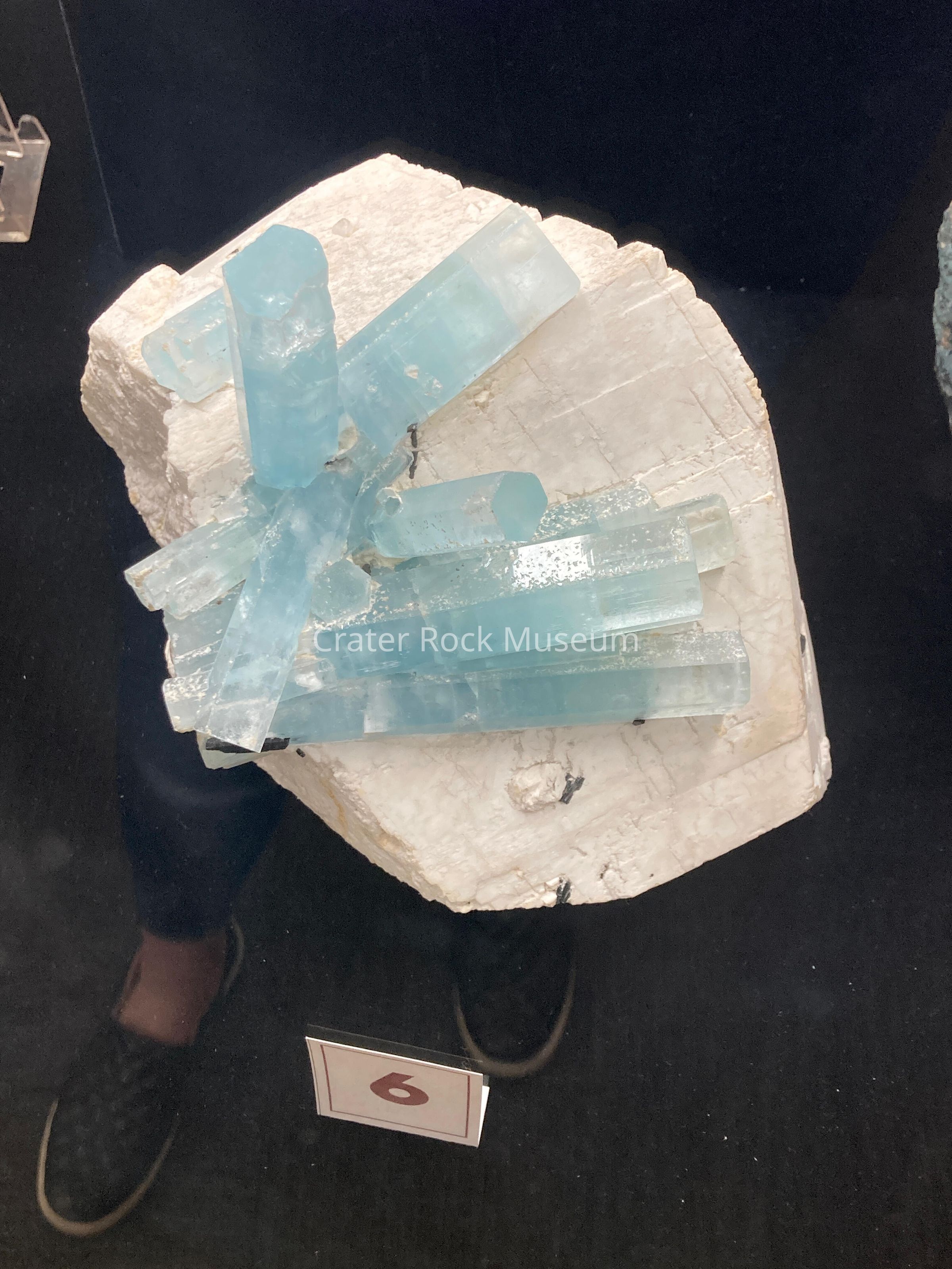 Description: Large white plan base with cylinder shaped light blue crystals coming off of it.