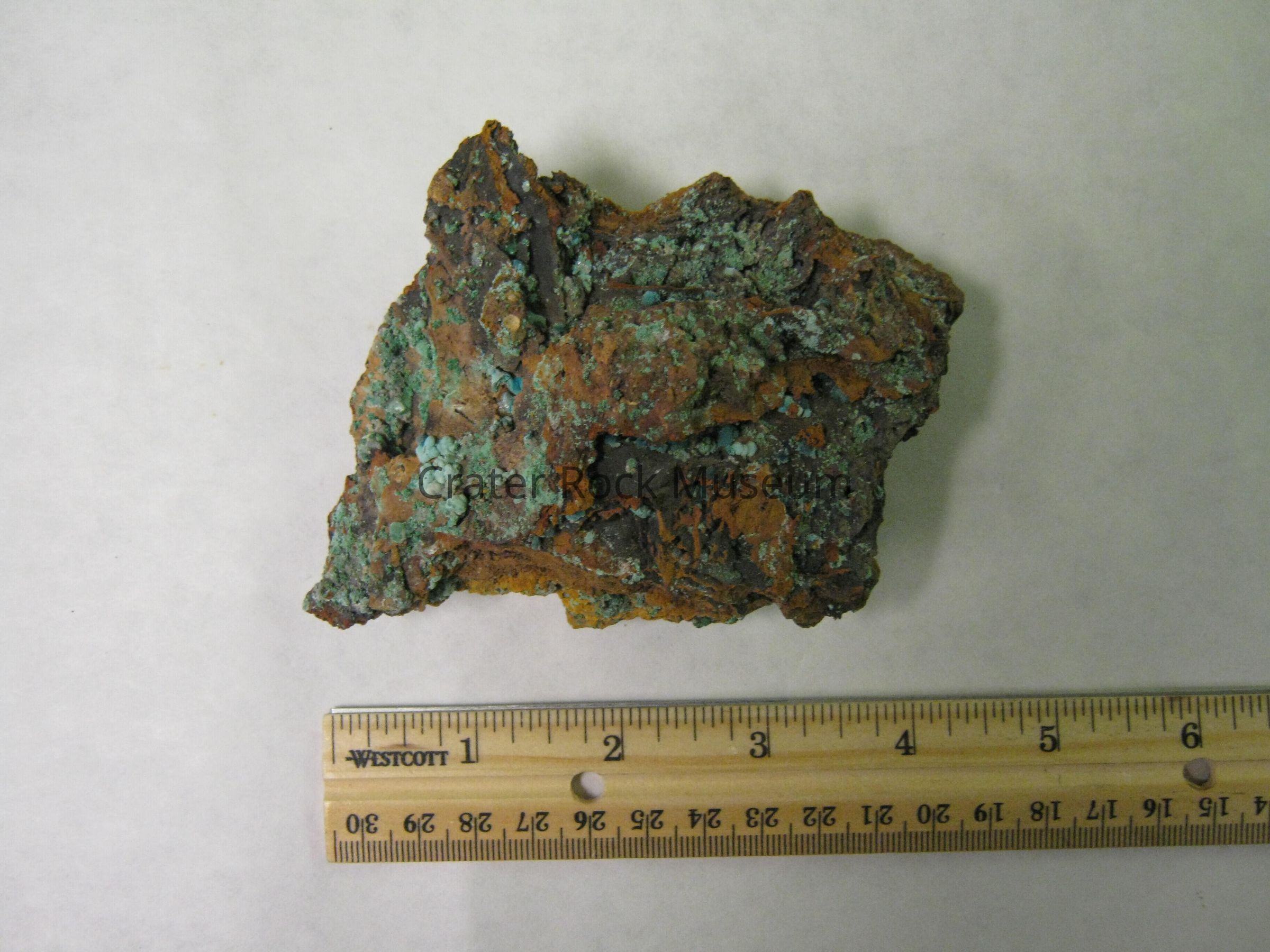 Description: Delmar described this specimen as a piece of Iron with copper mineral from a mine in Mexico. Colors: Brown and black iron with orange and yellow matrix, with green and blue crystals of a copper minerals which is the azurite & malachite