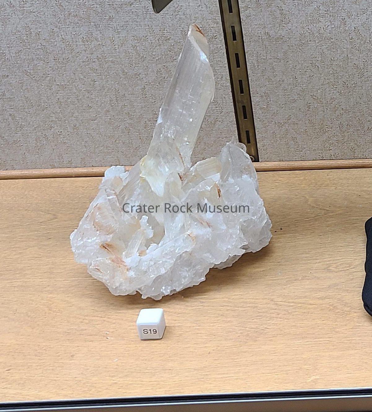 Descriptionh: Delmar described this specimen as a striking piece of transparents, clear selenite gypsum. One large crystal stick up out of a mass of crystals and is quite spectacular, though broken and reglued. It is still loose however.