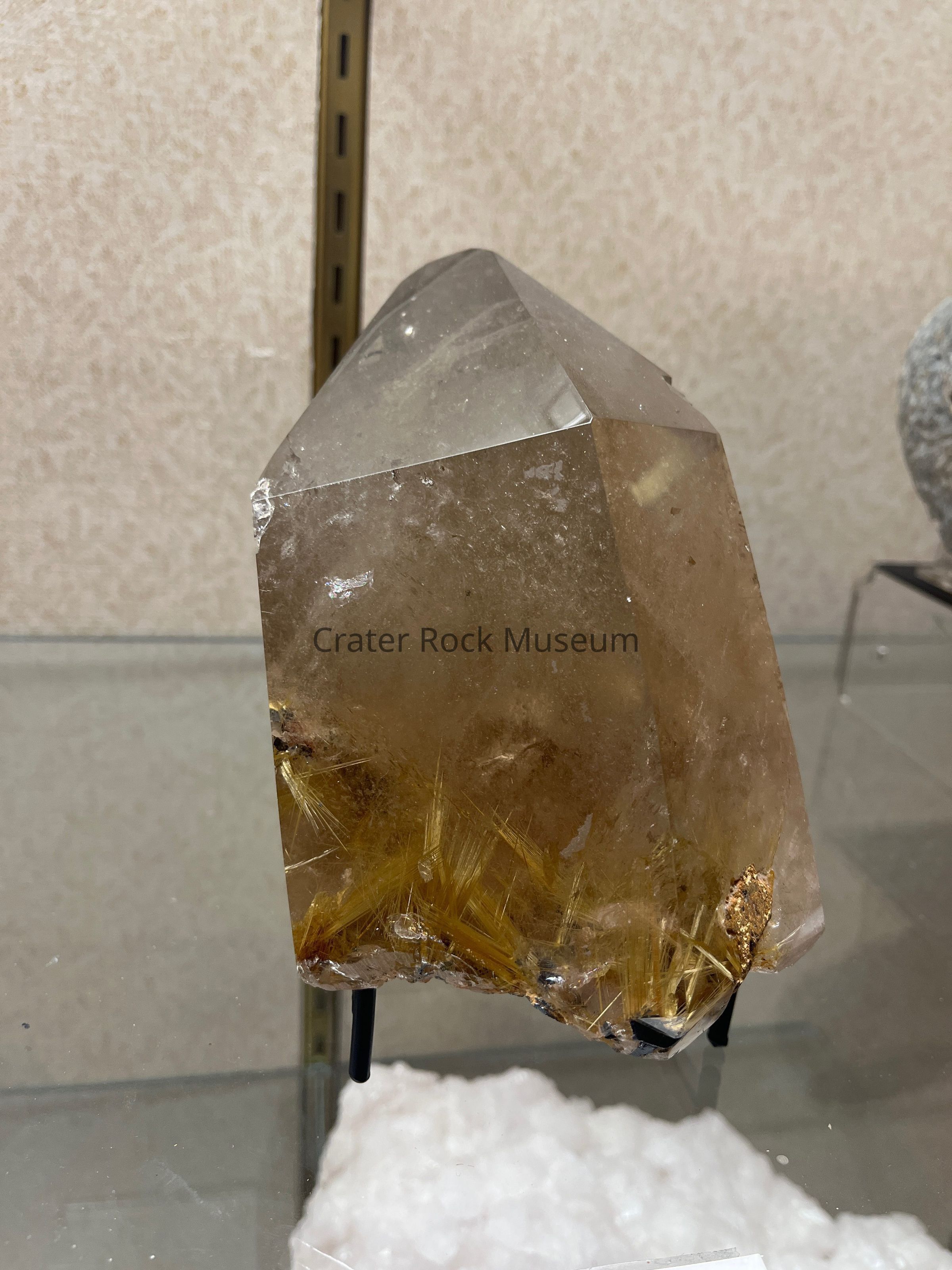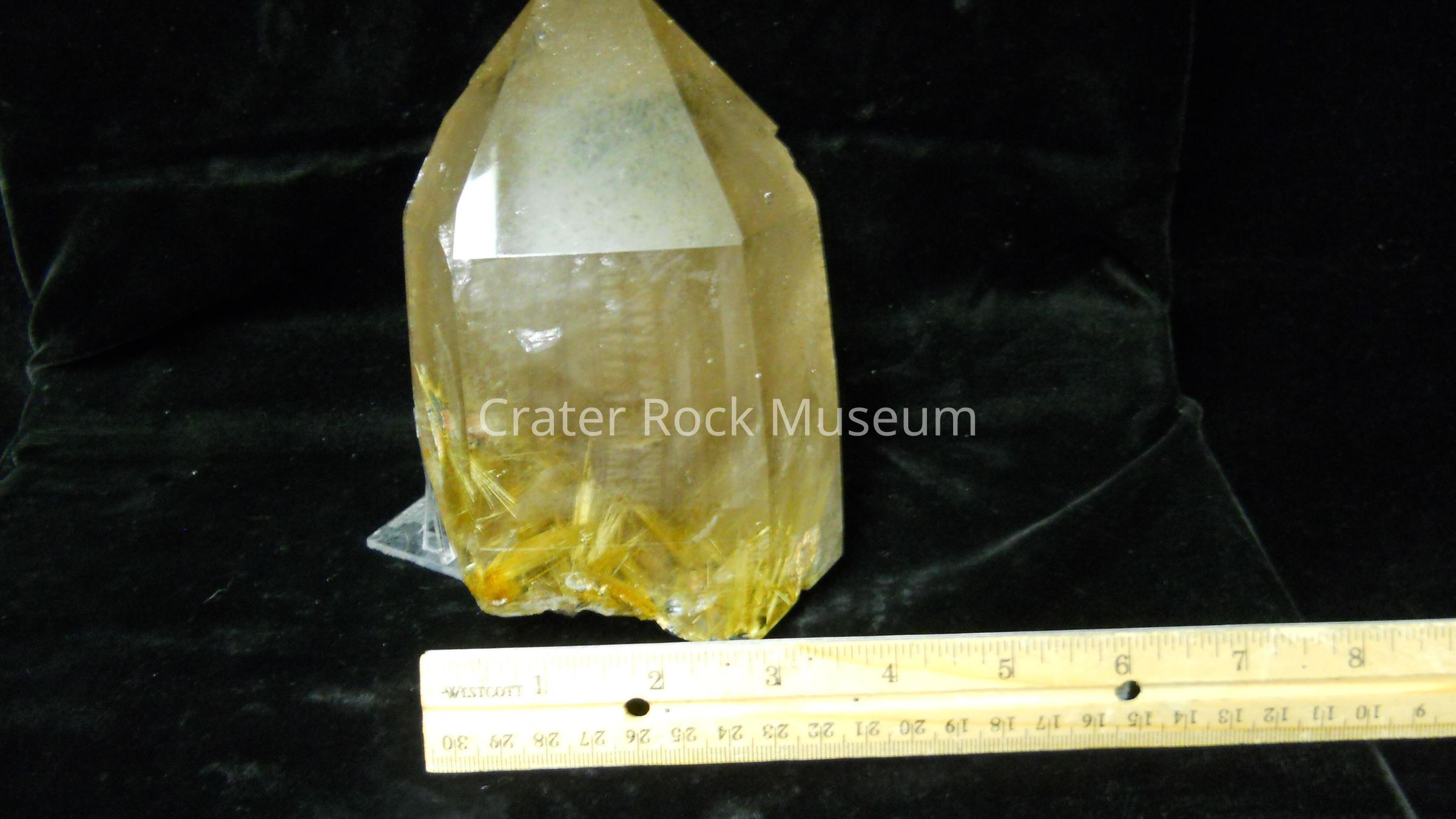 Descriptionh: Delmar described this specimen as a quartz crystal enhanced with fine needles of rutile at its base. Piece is slightly cloudy due to air bubbles and fracutres on side. Piece is a six sided, perfect prism with pyramid termination.