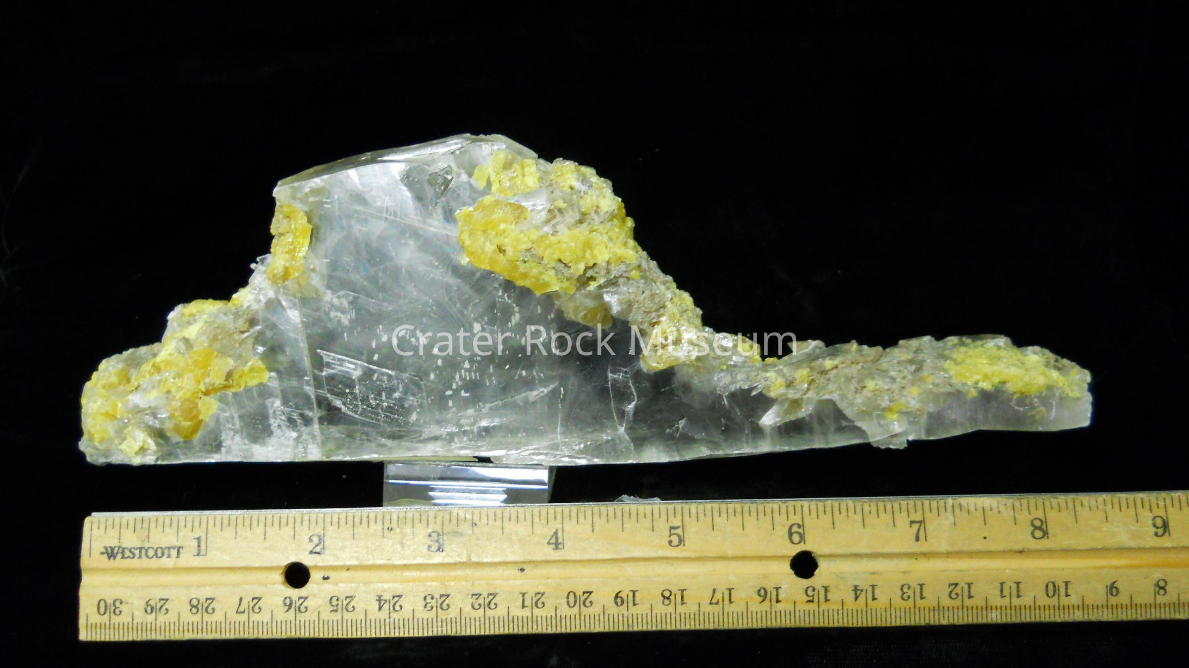 Descriptionh: Delmar described this specimen as one large gypsum crystal with sulfur. Crystals on it. A large clear, like glass, piece with yellow sulfur crystals. Has a kined of fish shape with yellow over nose and tail.