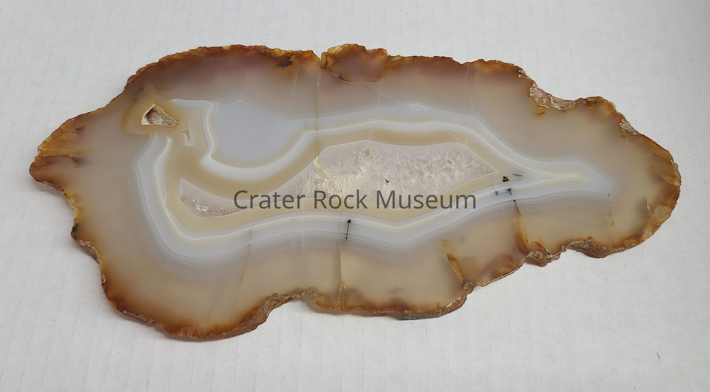 A 1/4" (.6 cm) thick slice of Agate from Bear Creek, Jackson County, OR discovered during Creek exploration for gravel. Piece has been broken in half and glued together. A crystalline center is surrounded by fortification lines in Beige, White and Light Blue. A transparent band surrounds this center with an edging in Orange-Brown. An open small crystallized hole is located to one side surrounded by fortification lines in Beige and Yellow. Some Dendrite is visible.Dimensions