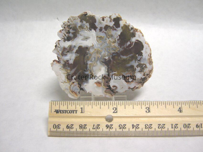 Description: Polished face shows multi-colored brown, grey, white, yellow, red with agatized swirls