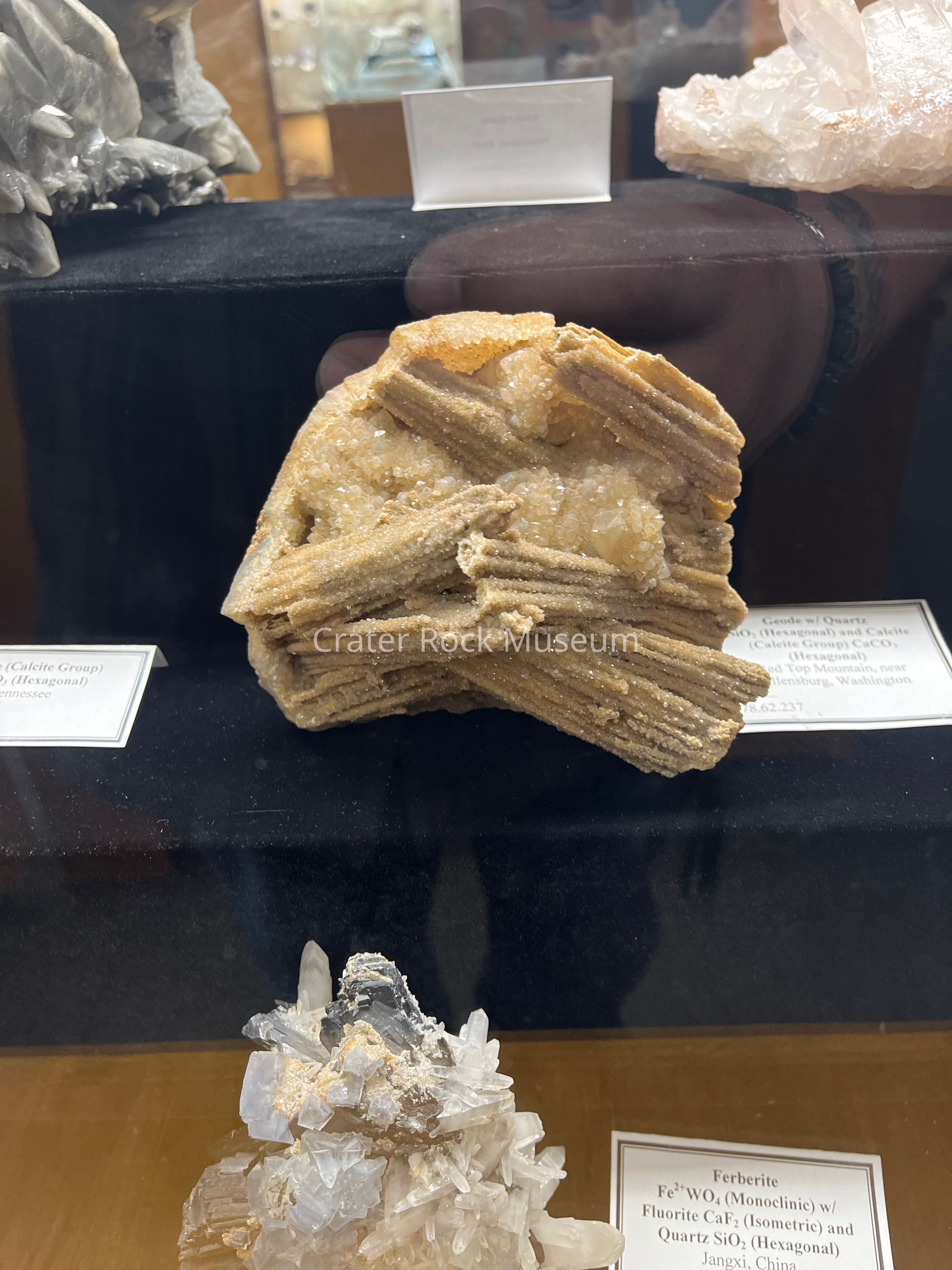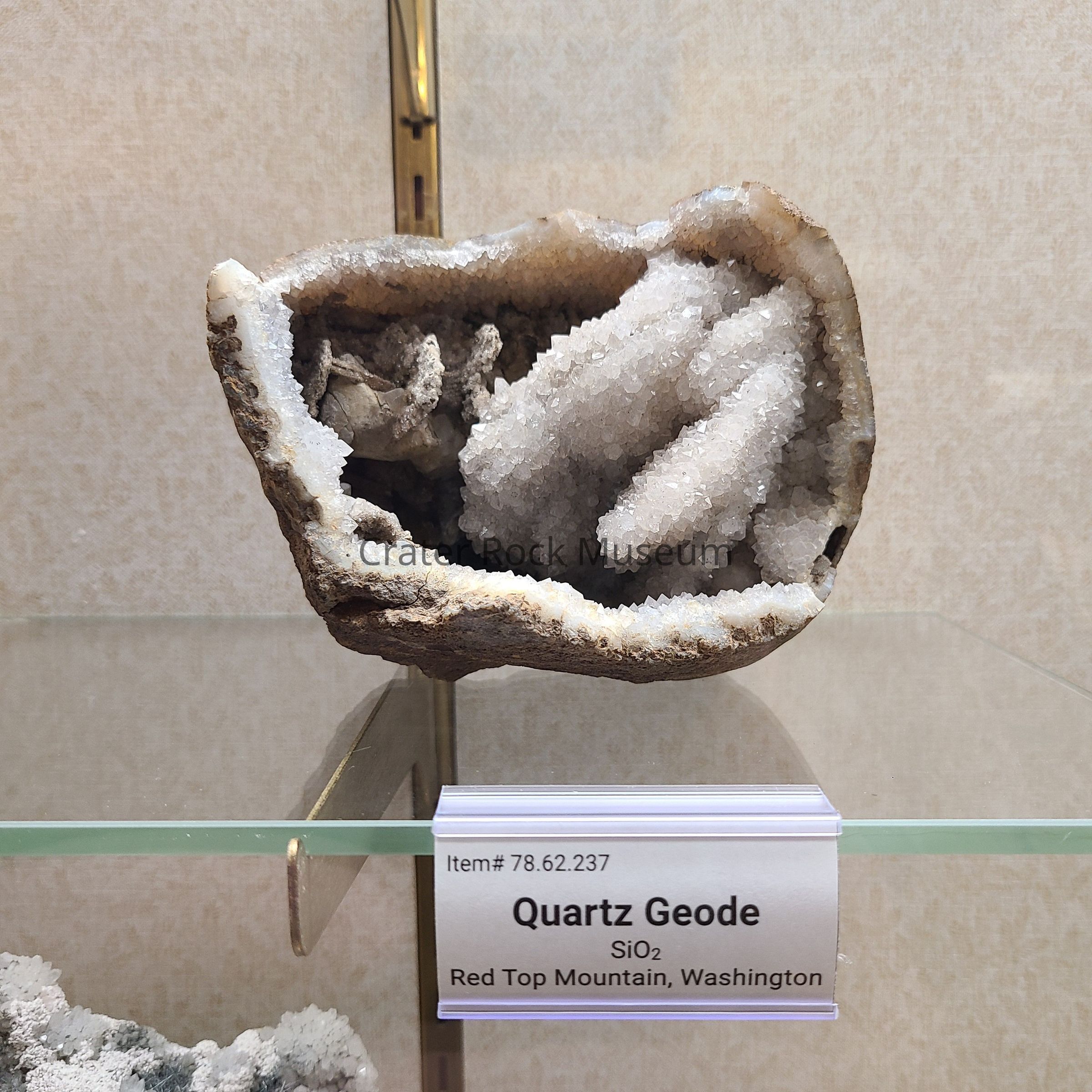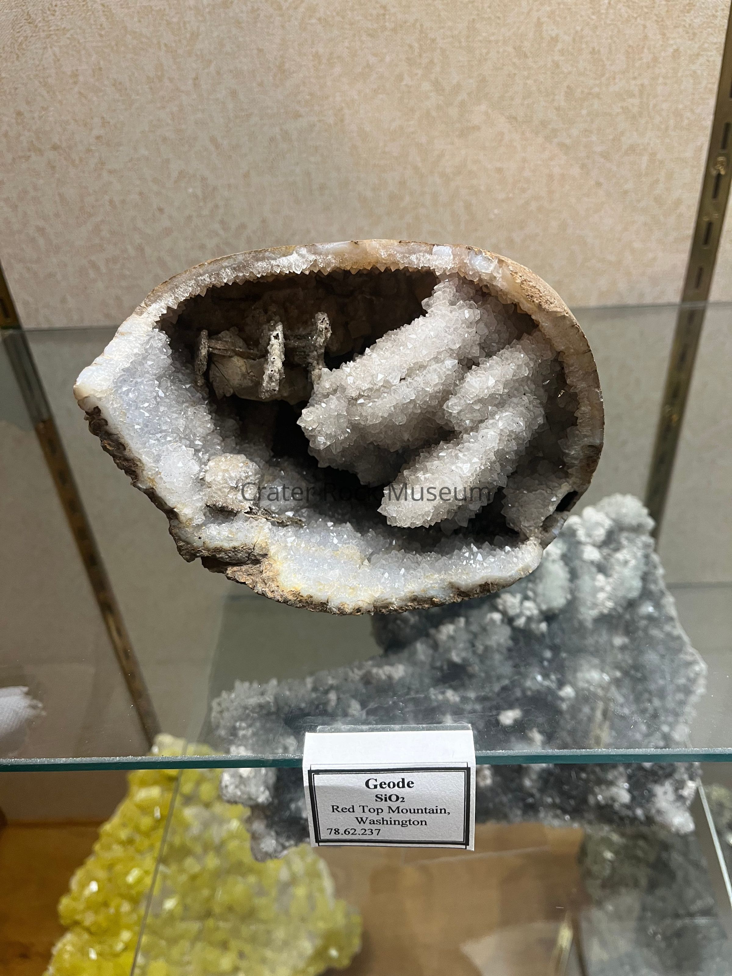 Description: Delmar described this specimen as one small and four large pieces of geodes with calcite and quartz. from red top mountain, near Elllenburg, washington, Colors: Broken thin brown outer shell with blue and grey agate, reveals quartz lined interiors (grey and blue, with calcite crystals in long spaghetti shaped crystals and quartz like shaped crystals (in brown and greys) Pieces vary in size.Collection