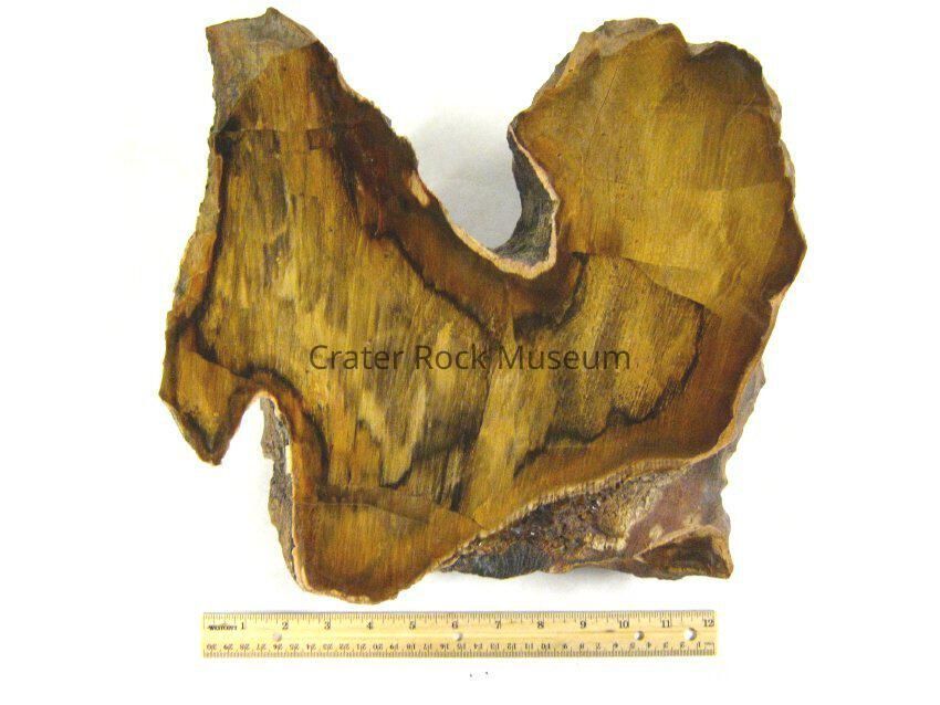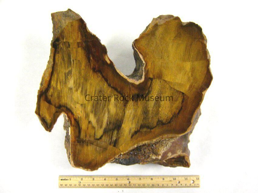 Description: Irregularly shaped specimen with polished face. Outer edges are brown and golden yellow in distinct cells.Collection