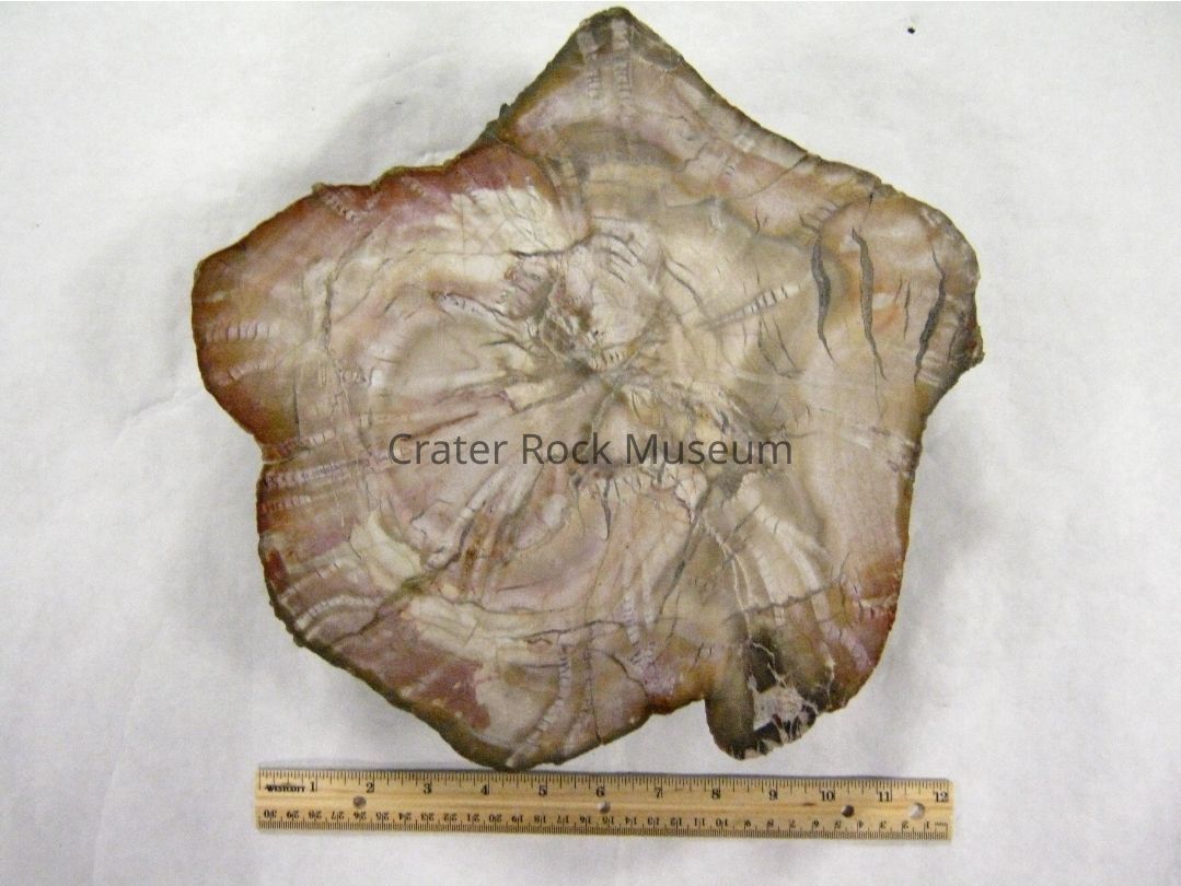 Description: Delmar describes this pieces as a of petrified wood , variety "Woodworthia" from central Arizona. Colors: beiges, light greys, pinks, reds, tans. "Tracks" and surface cracks. Silicate cracks present. Tropical tree probably from Jurassic period (Mesozoic era). Thorns seen on outside.