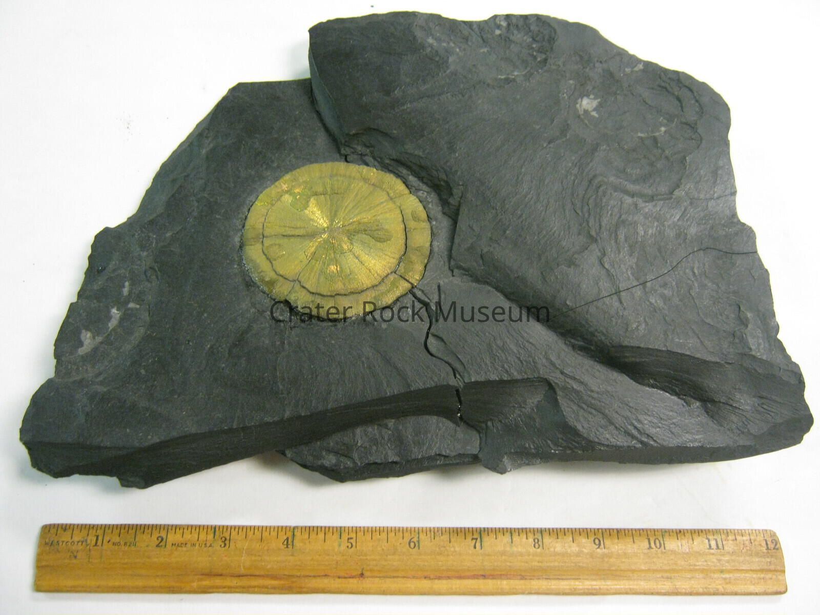 Description: Similar to pyrite the crystals are in the shape of a sand dollar and is called a marcasiter dollar, the matrix is slate.