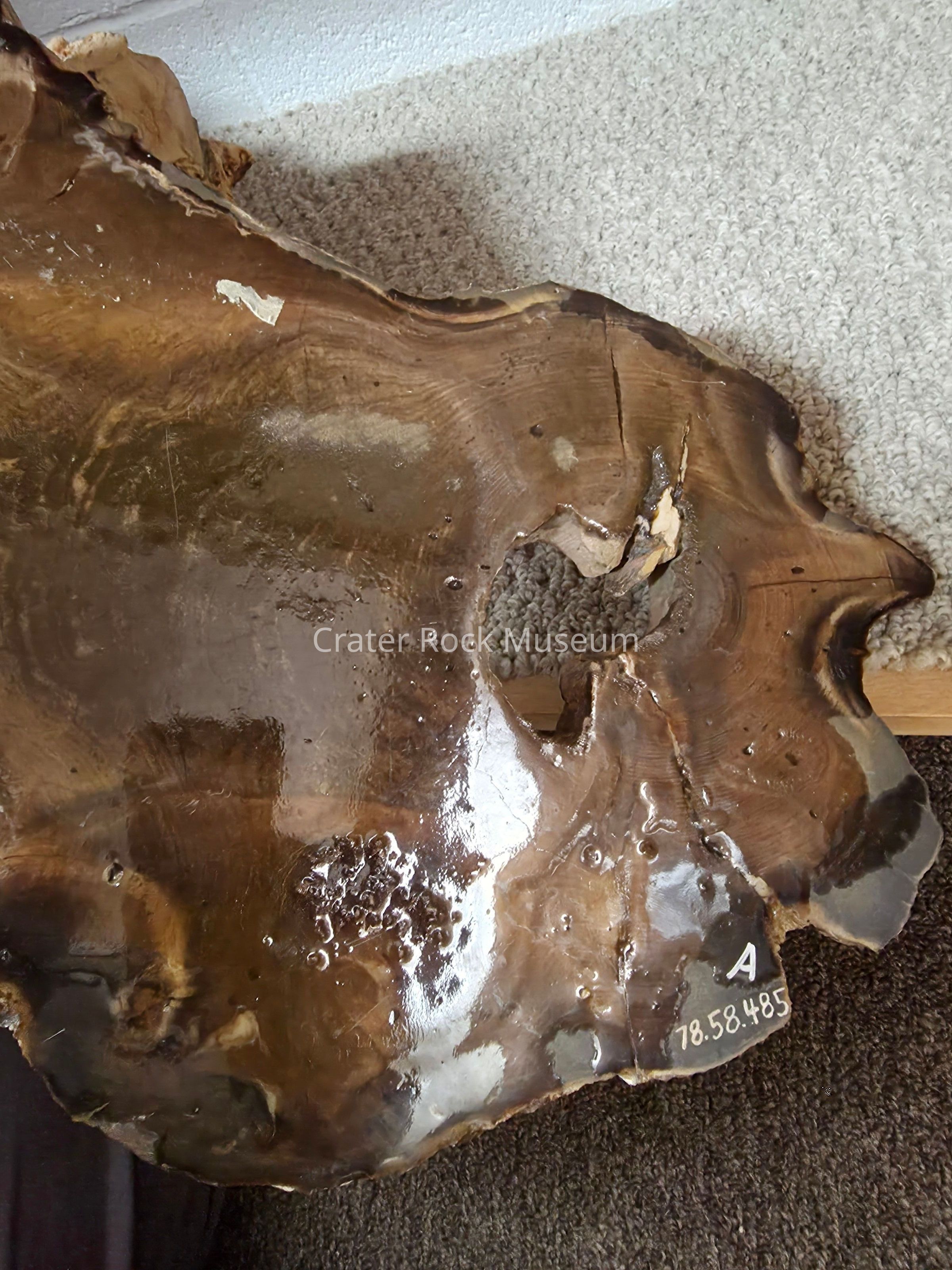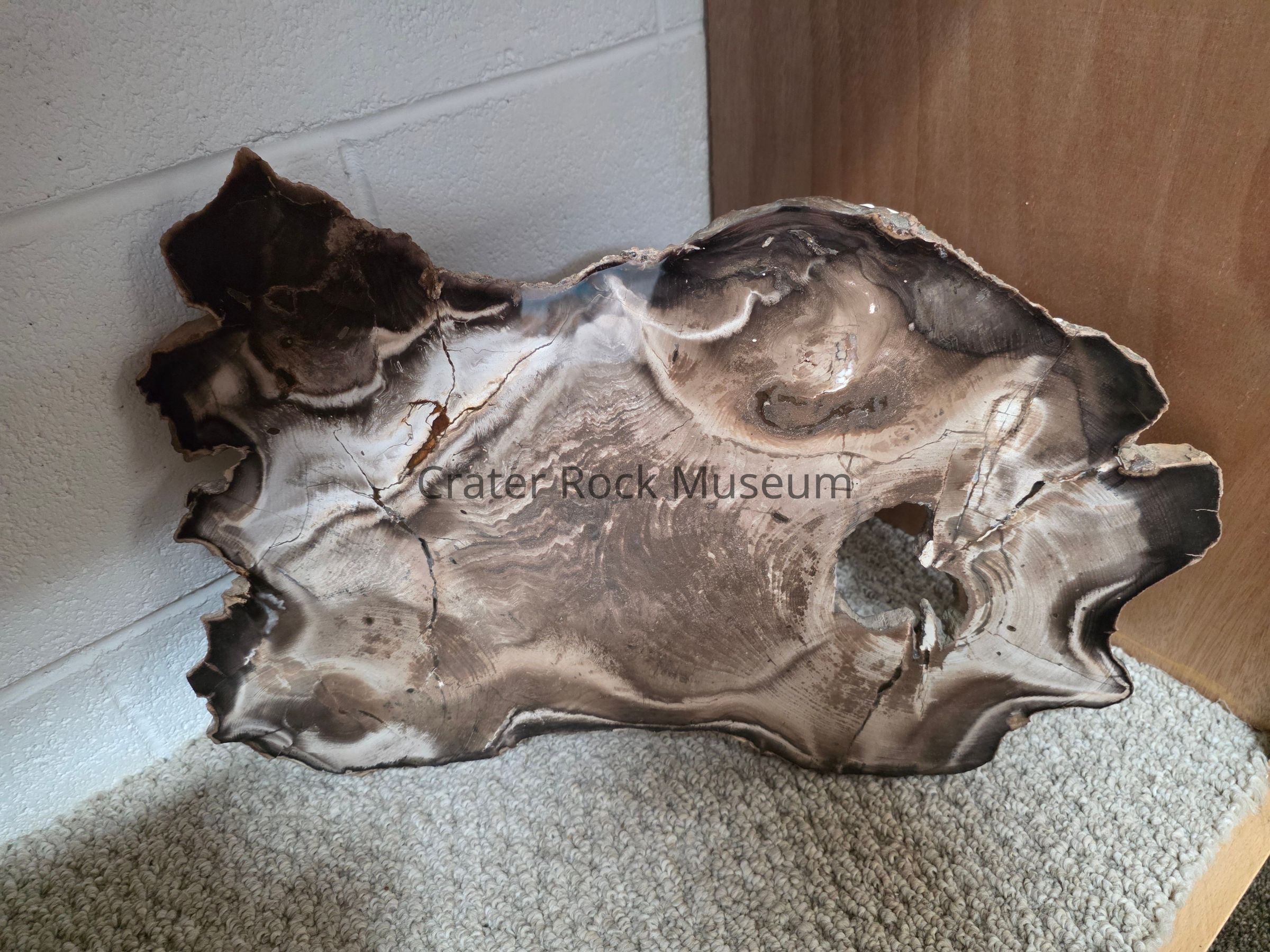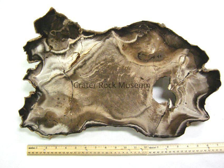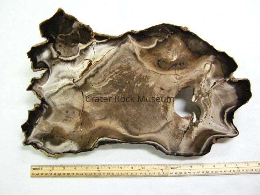 Description: Thick slab with polished face. Colors are beiges, browns, tans and black. There is a large hole to one side. Growth rings are visible. Numerous cracks are seen as well.
