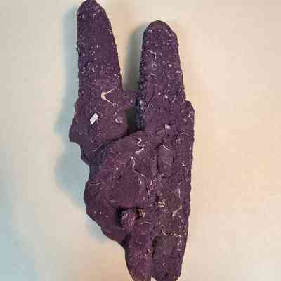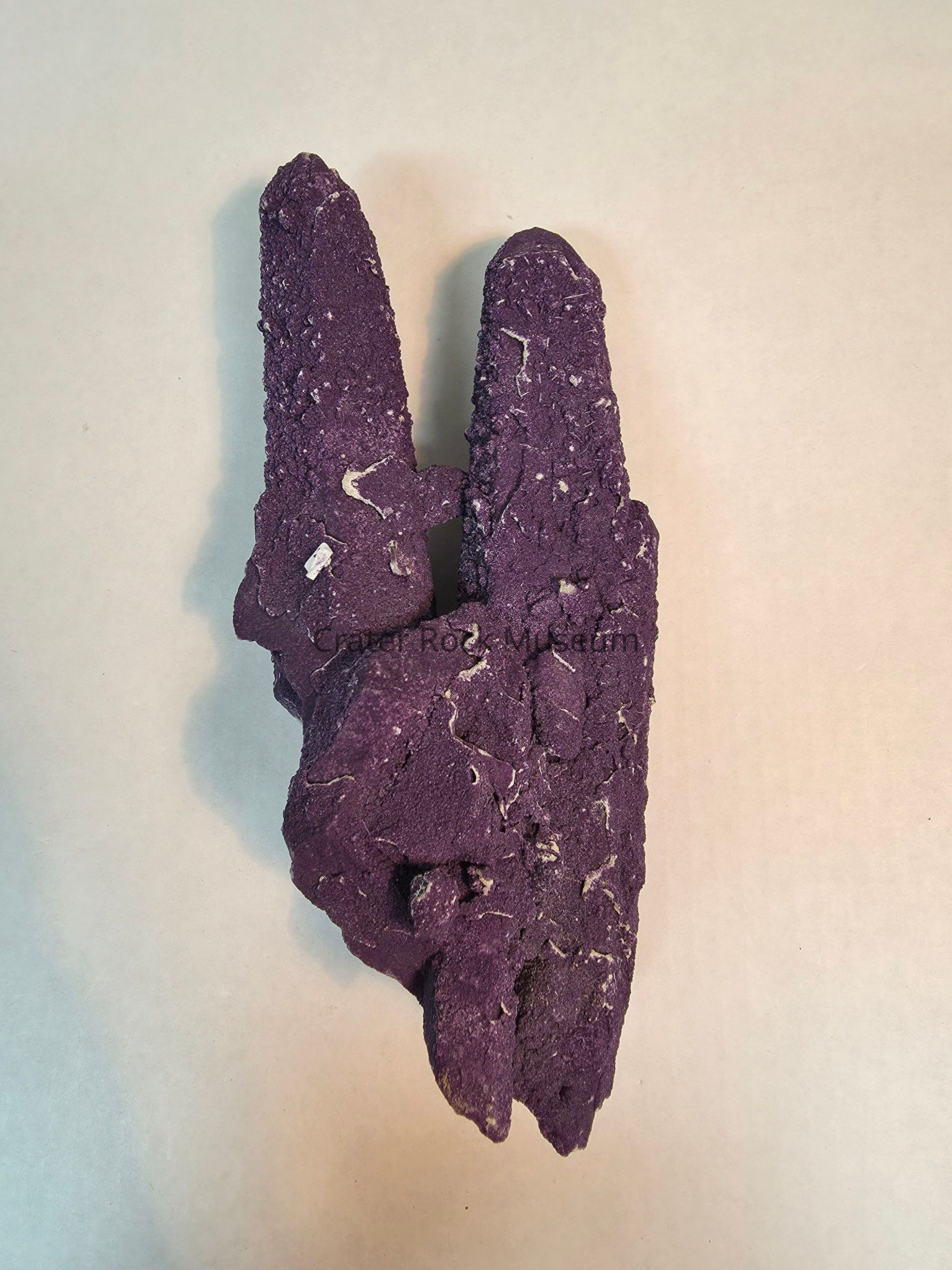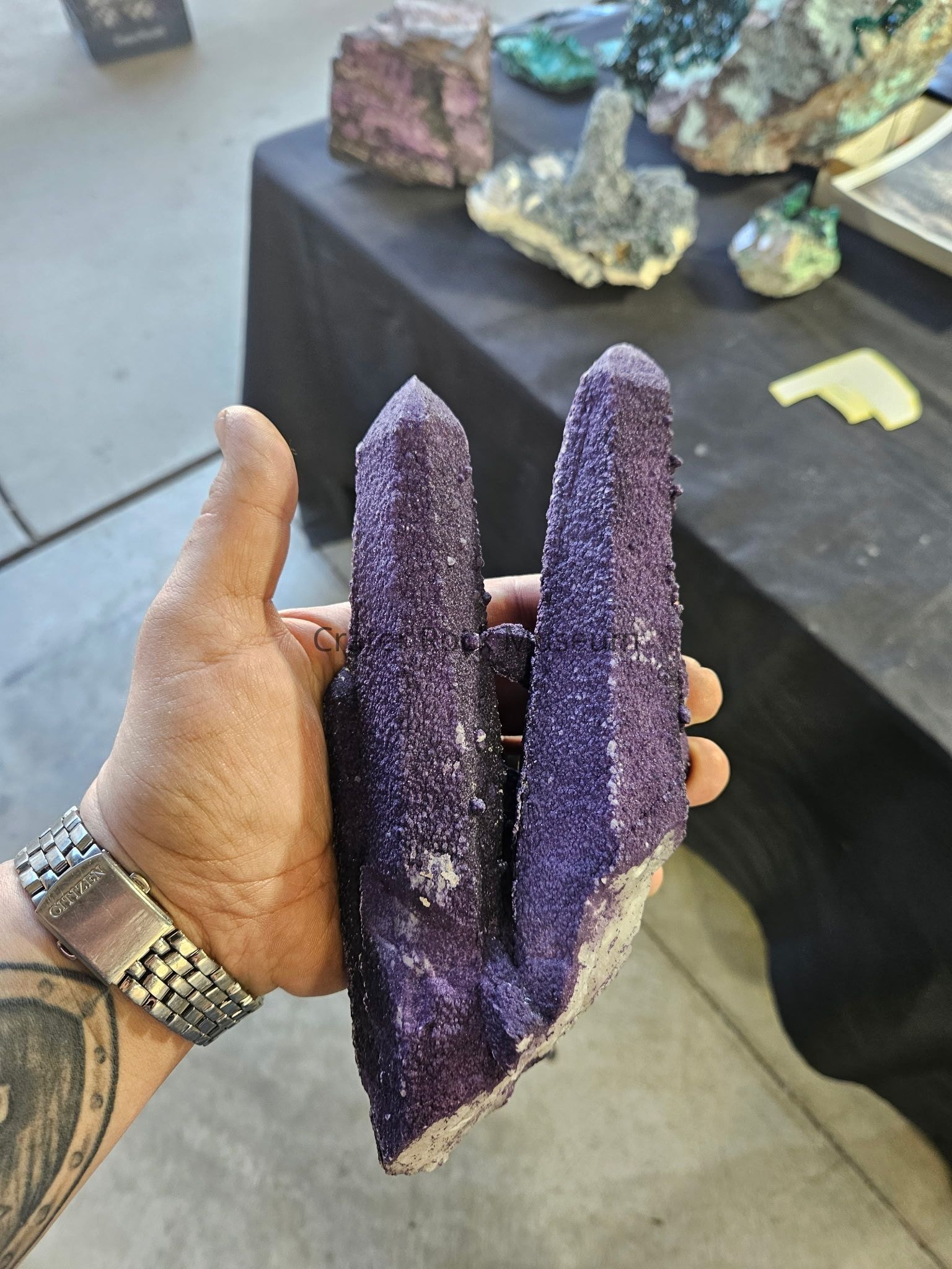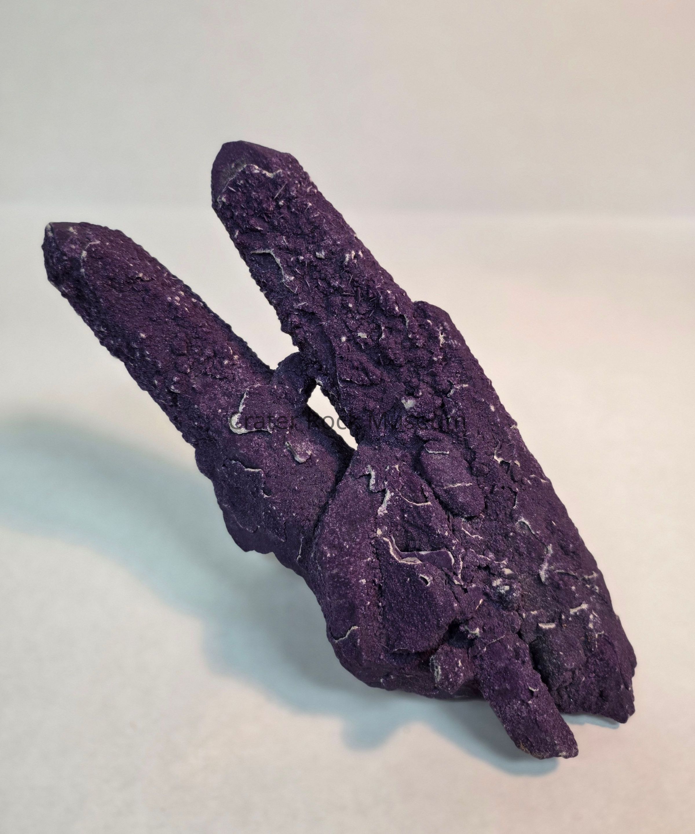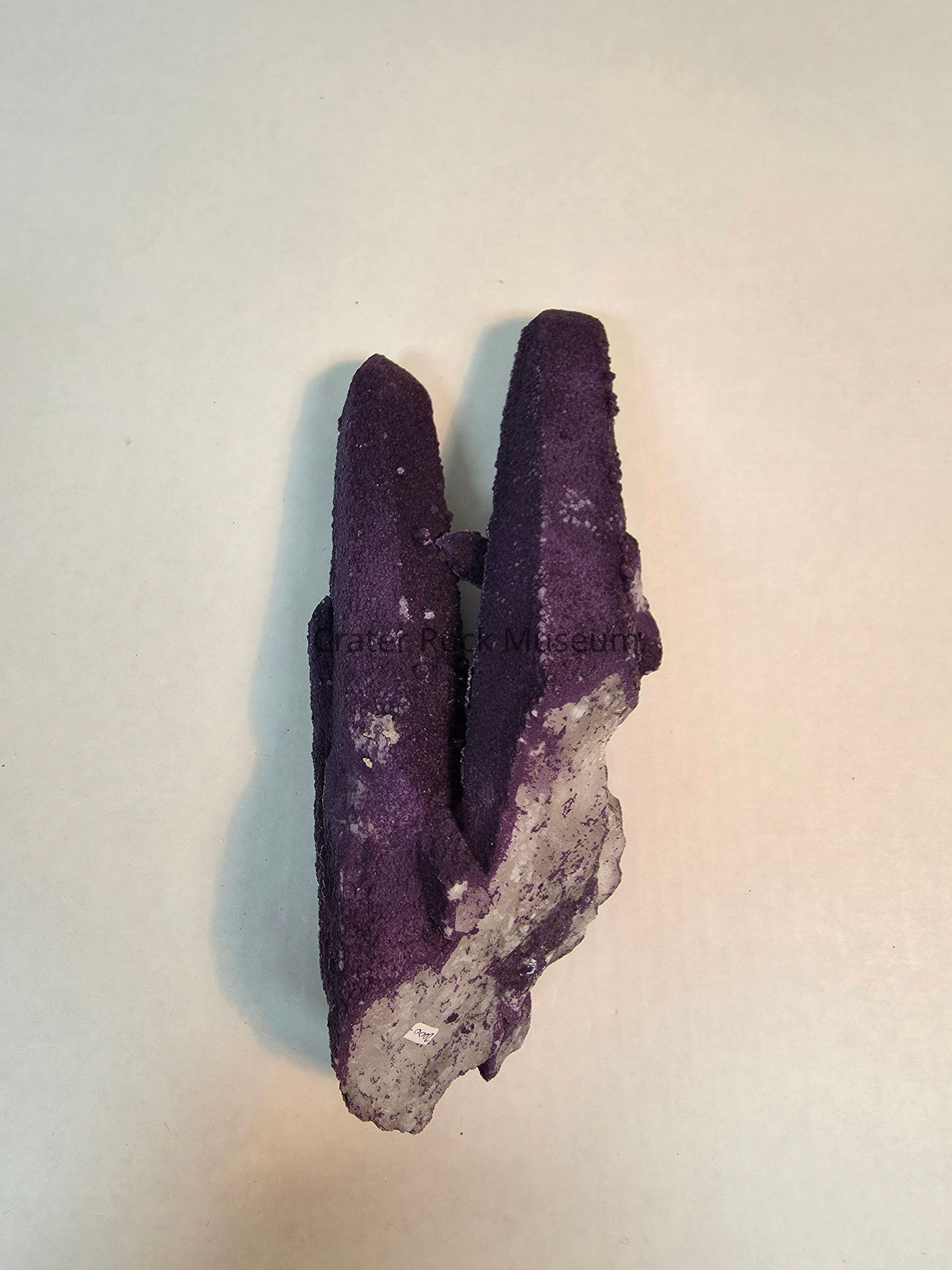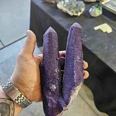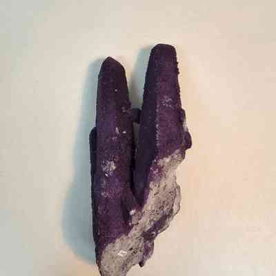 Twinned quartz points with deep purple fluorite overgrowthLocation